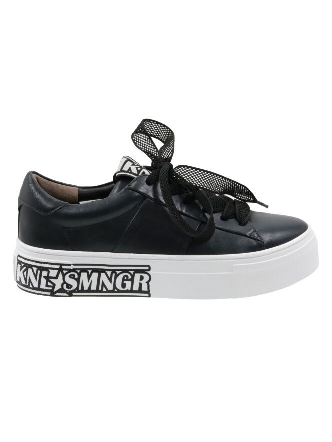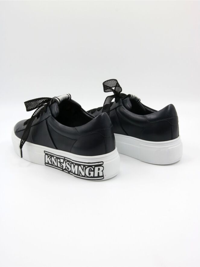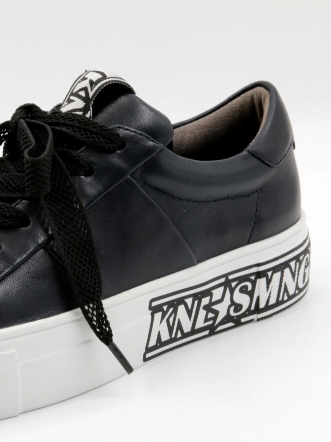 A sneaker from Kennel und Schmenger in navy blue. On the outer side of the off-white sole, the text "Kennel Schmenger" is printed in black. The sneaker features laces in a perforated mesh structure. The interior is lined with leather.