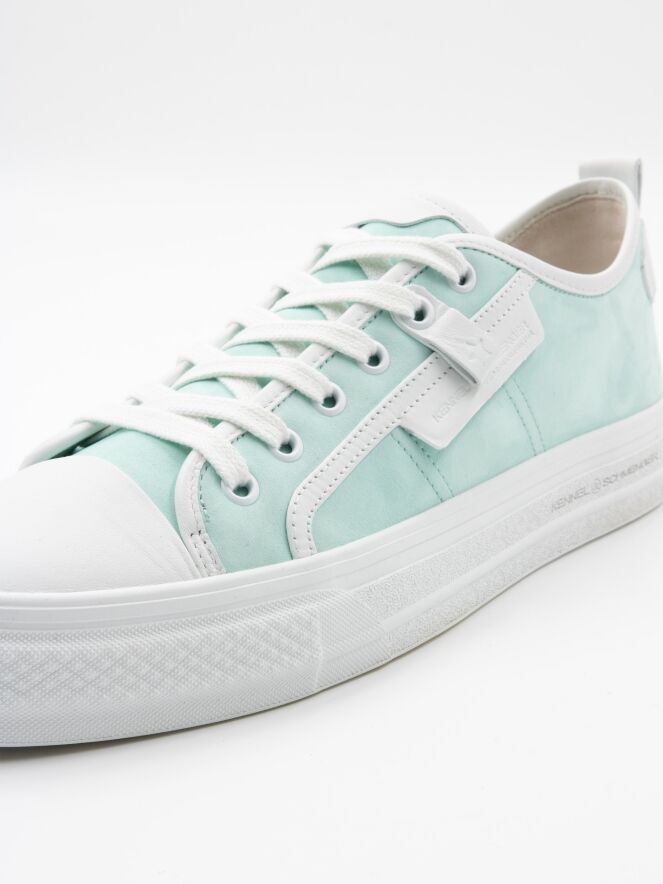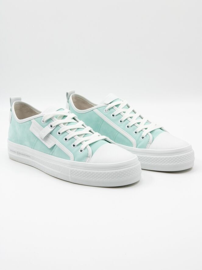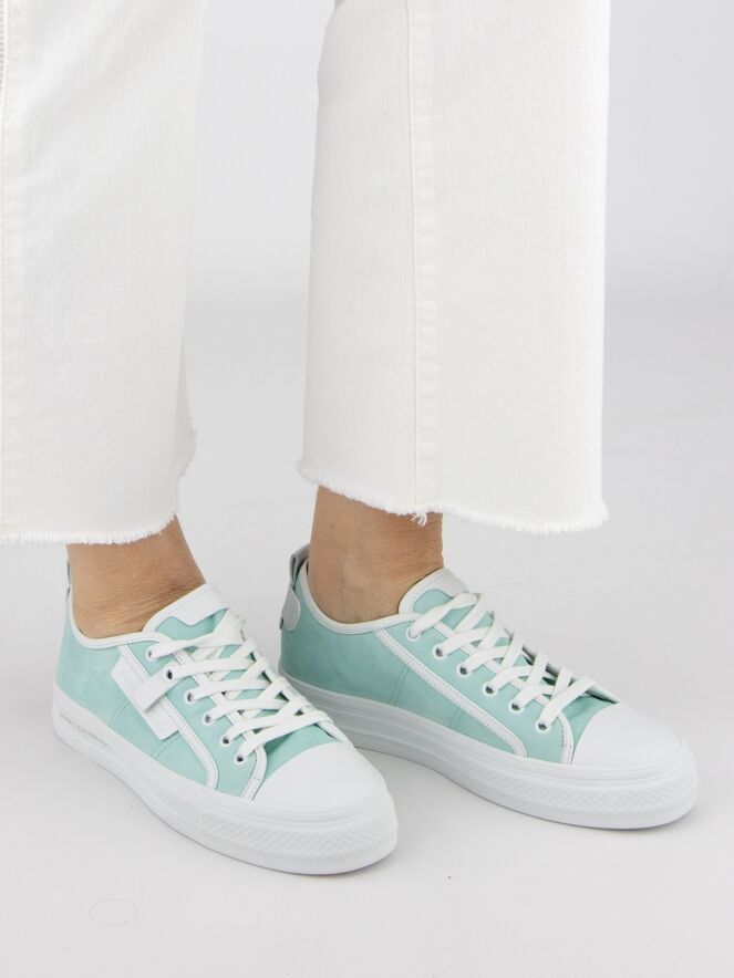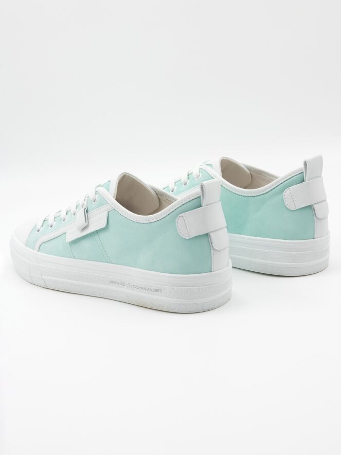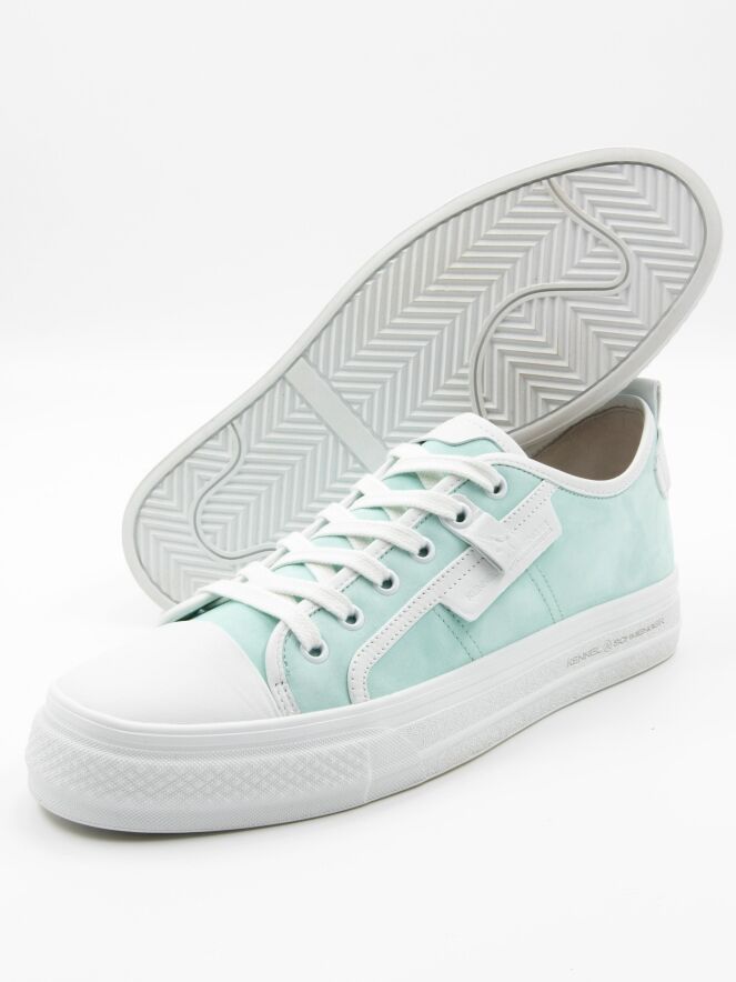 A low sneaker by Kennel & Schmenger in a turquoise color. The forefoot is in white leather and there are several white stripes along the sides and shaft. The platform sole is in white and the inside is lined with leather.