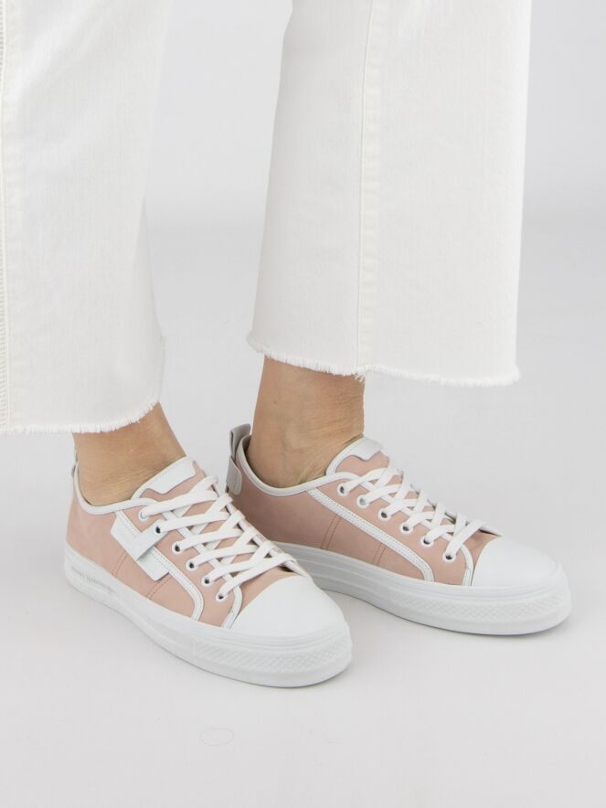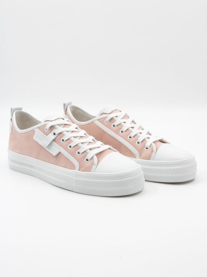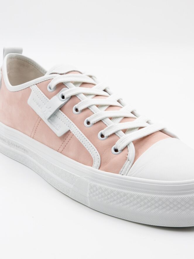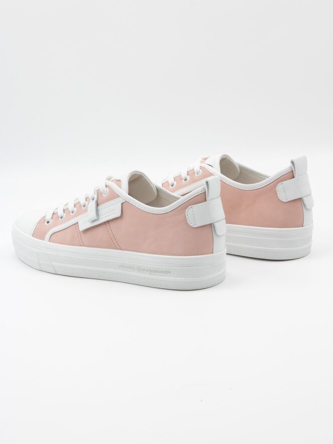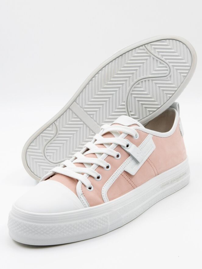 A low sneaker by Kennel & Schmenger in a pink color. The forefoot is in white leather and there are several white stripes along the sides and shaft. The platform sole is in white and the inside is lined with leather.