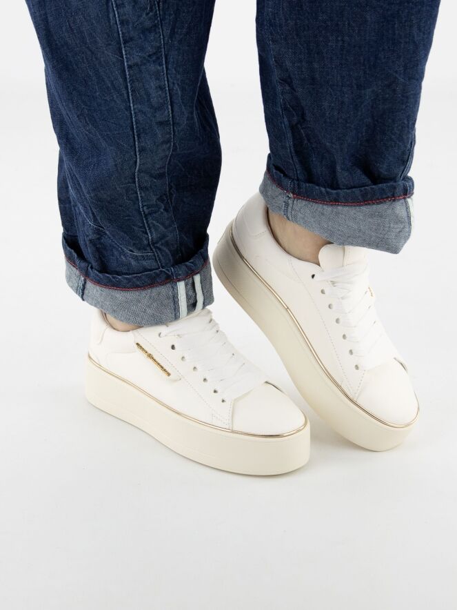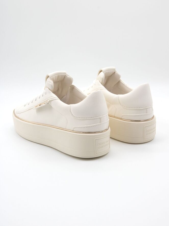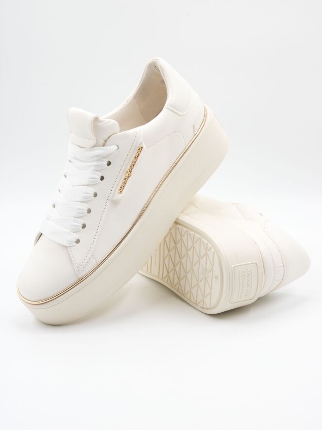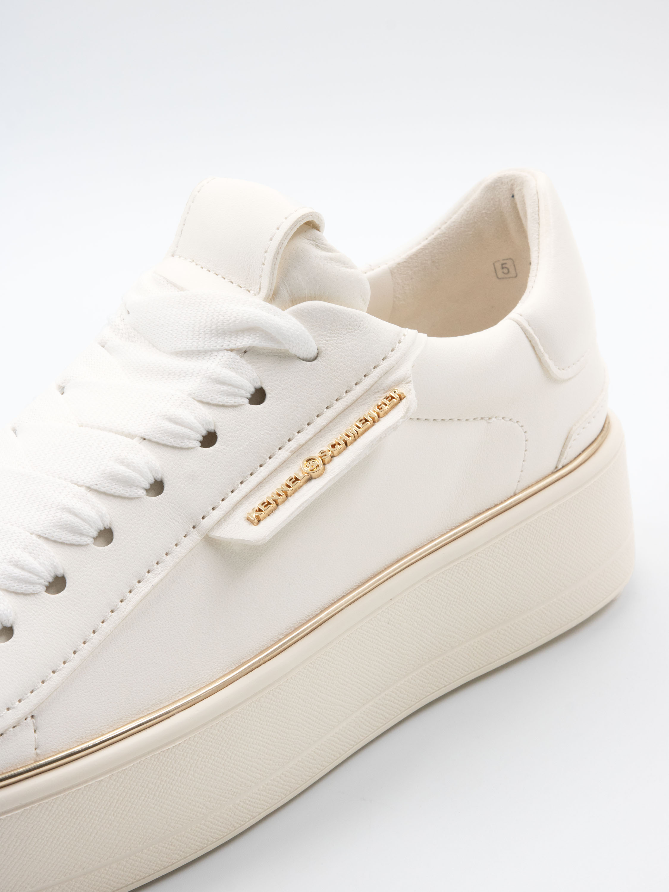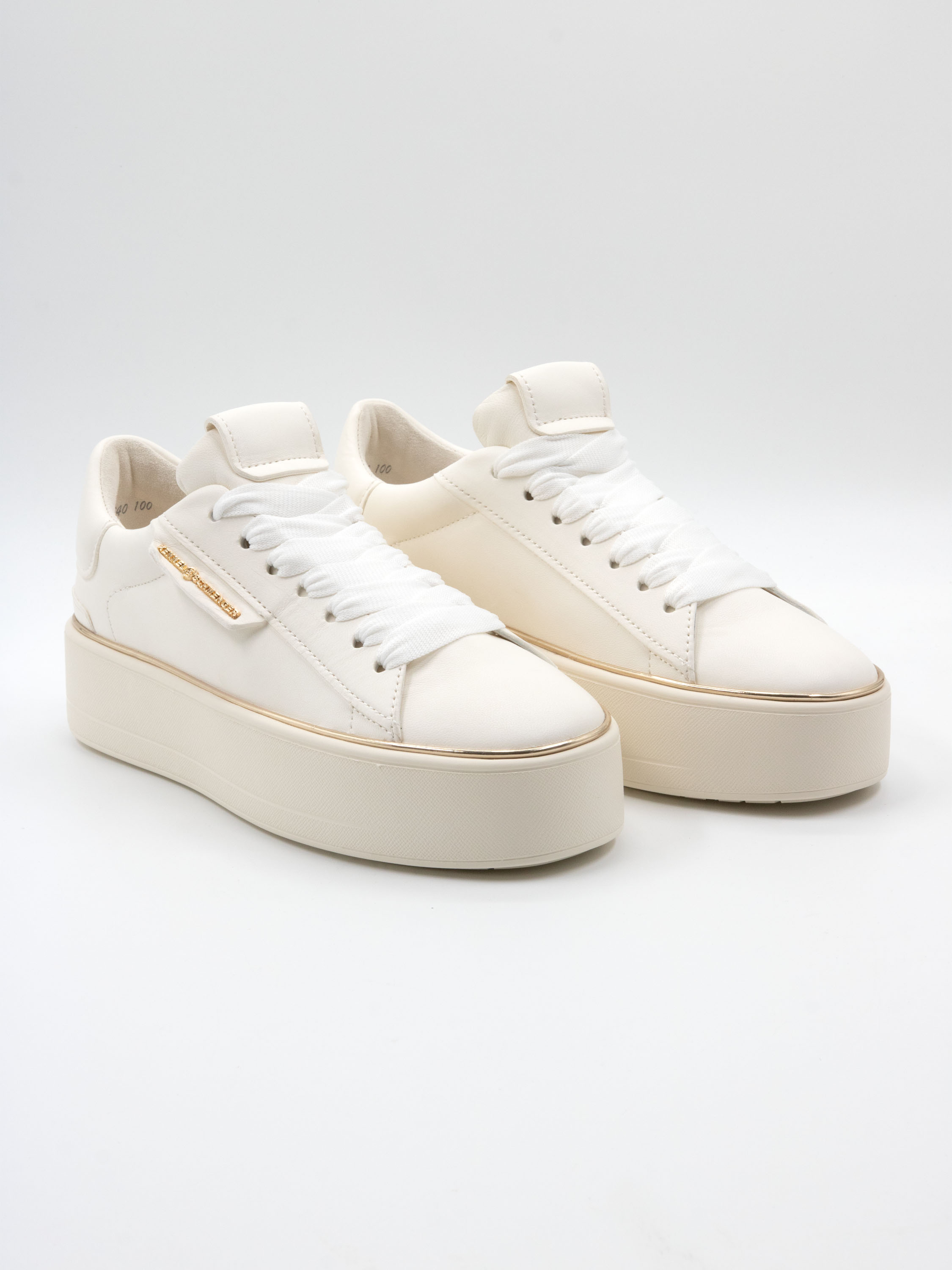 A luxury sneaker from Kennel & Schmenger in off-white. Along the off-white sole is a gold-colored trim. The laces are made of matte white satin fabric. The inside is lined with leather.
