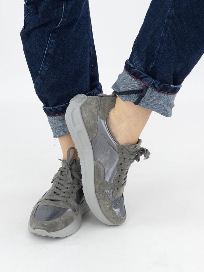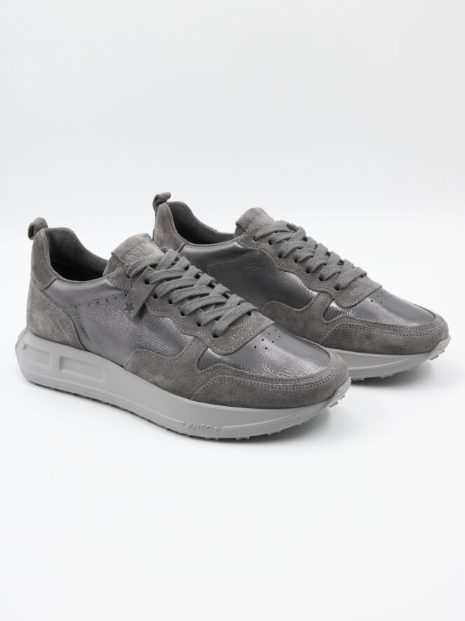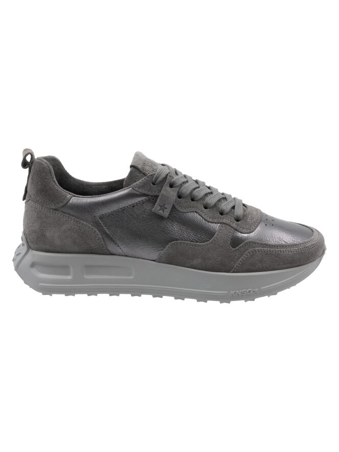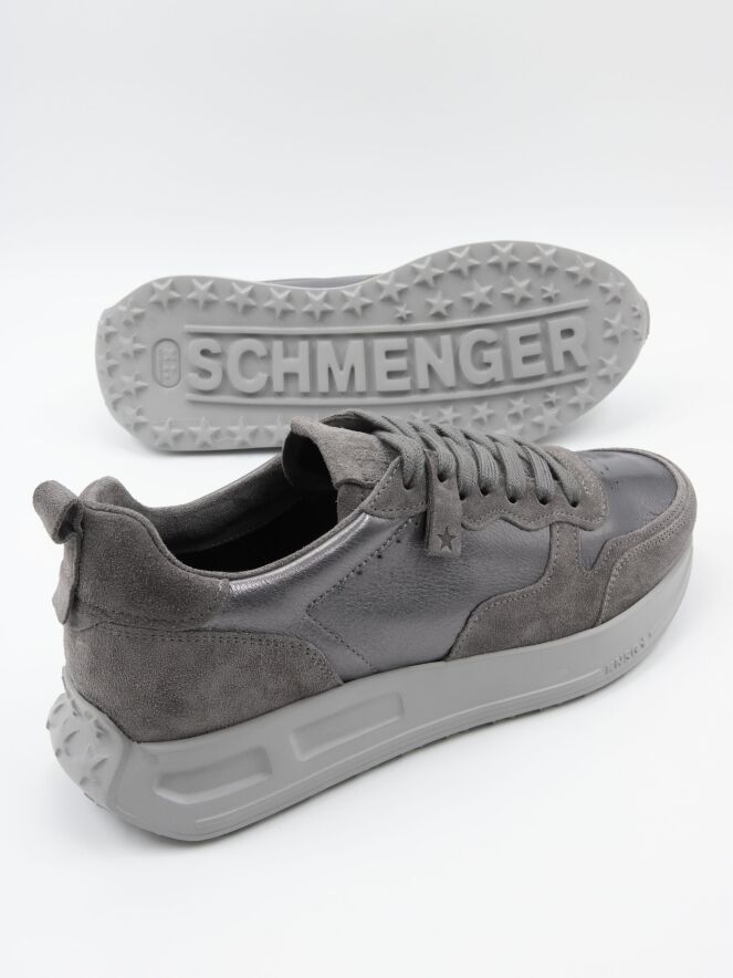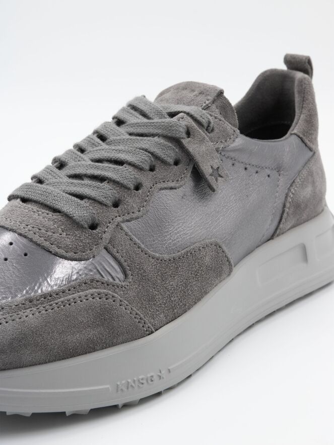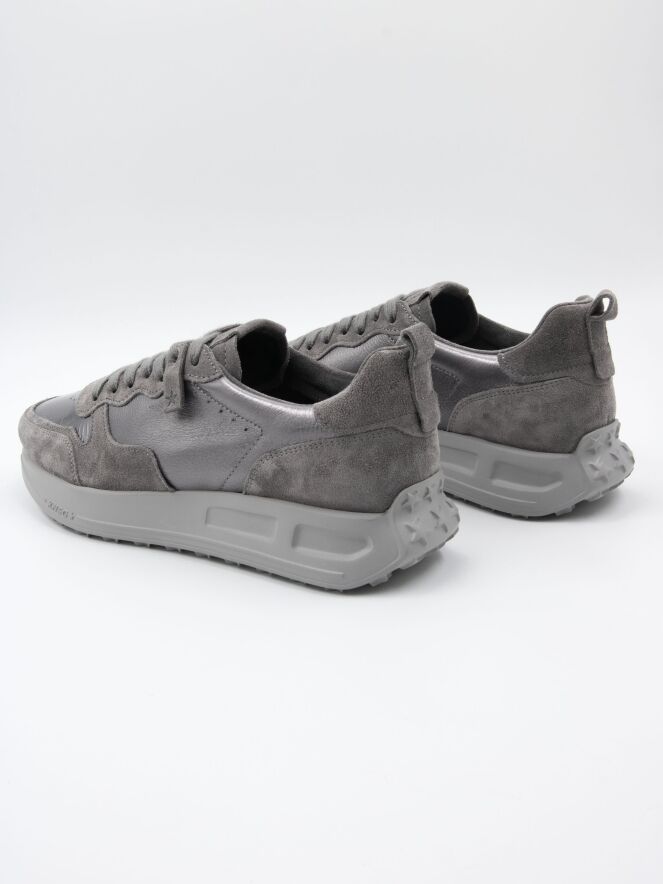 A sneaker from Kennel & Schmenger in a metallic gray color. Along the edge of the toe to the sides, at the heel, and along the laces, there is a sporty gray velour suede. The sole is slightly raised at the heel and the interior is lined with leather.