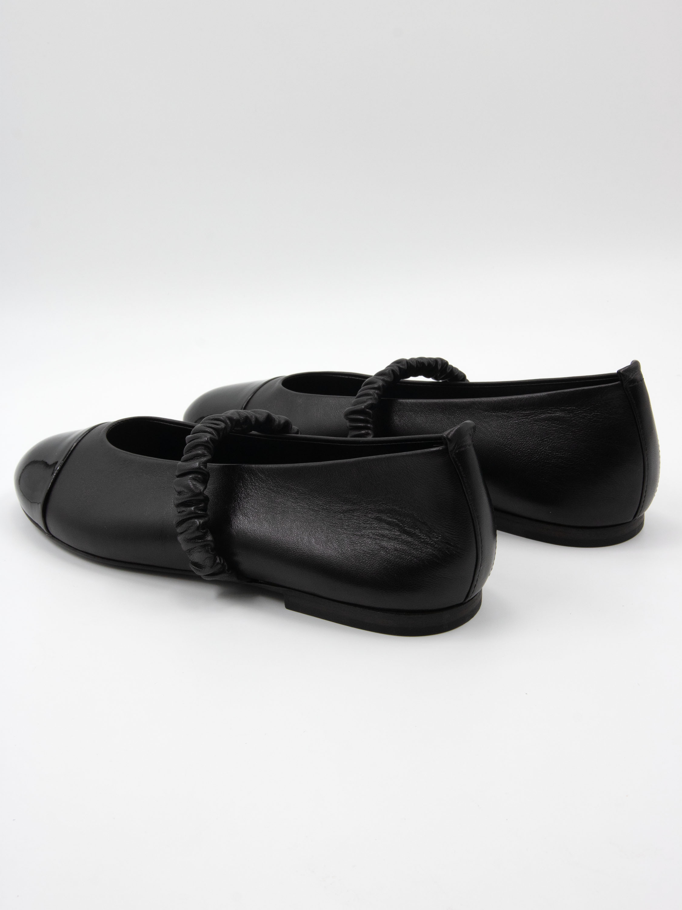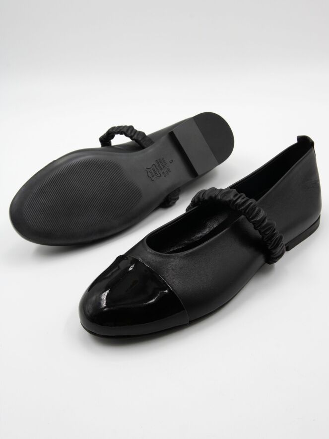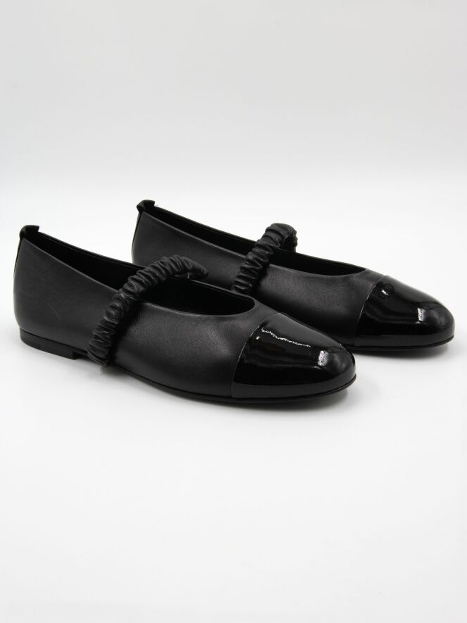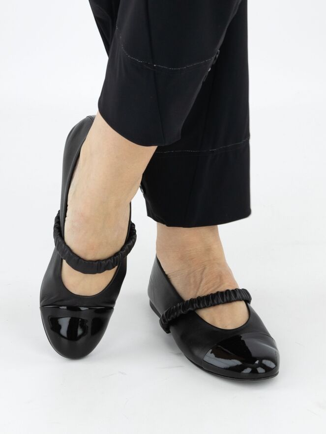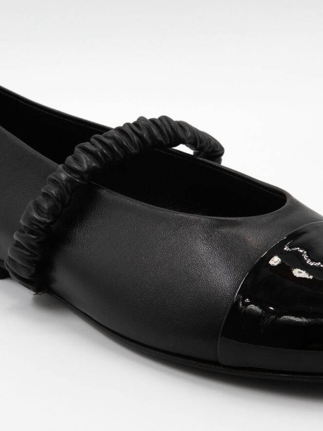 A ballerina from Kennel & Schmenger in black. The leather of the ballerina is very supple, and the toe is in black patent leather. There is a decorative finely pleated leather trim over the forefoot. The interior is lined with leather.
