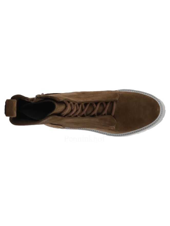 A short boot from Kennel & Schmenger in the color cognac. From the forefoot to the shaft is a decorative lace. There is a zipper on the inside. The sturdy gray sole is jagged. The inside is lined with leather.