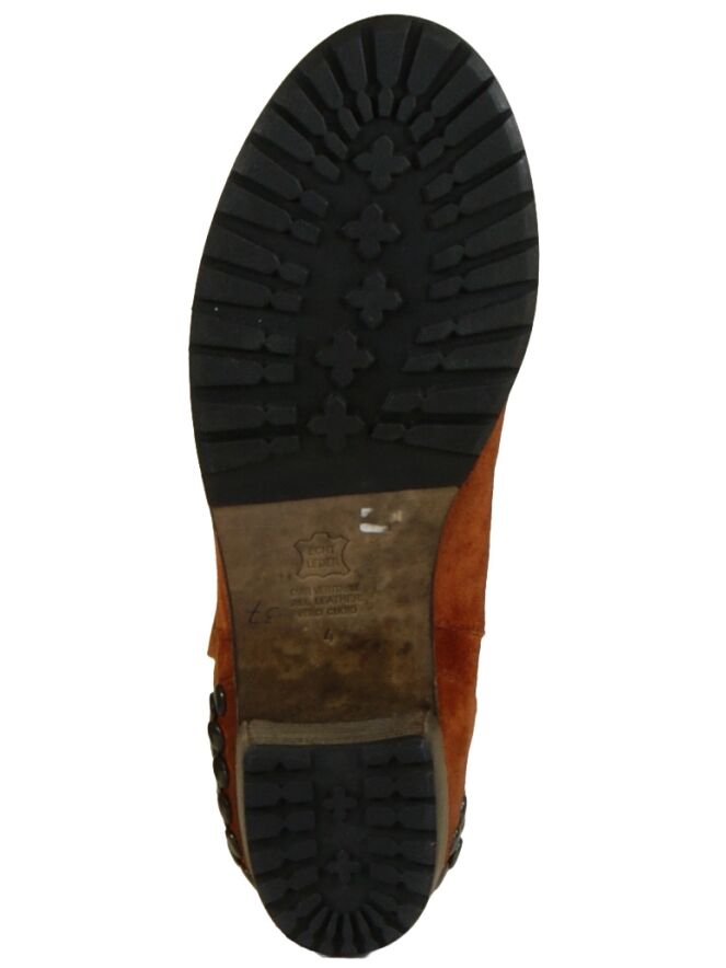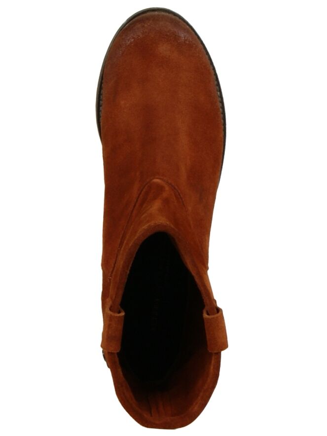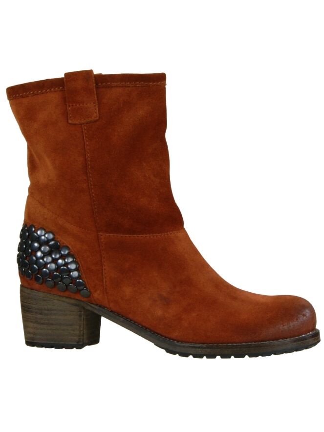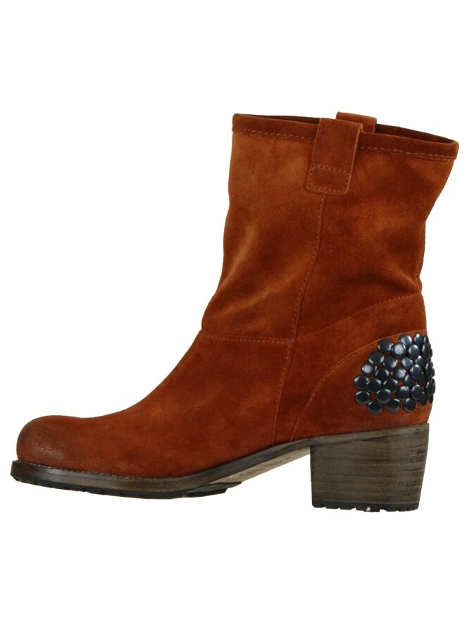 A short boot of the brand Kennel & Schmenger in the color rust brown . The suede of the boot is light sanded. On the heel are flat and round studs in the color black. The boot is unlined.