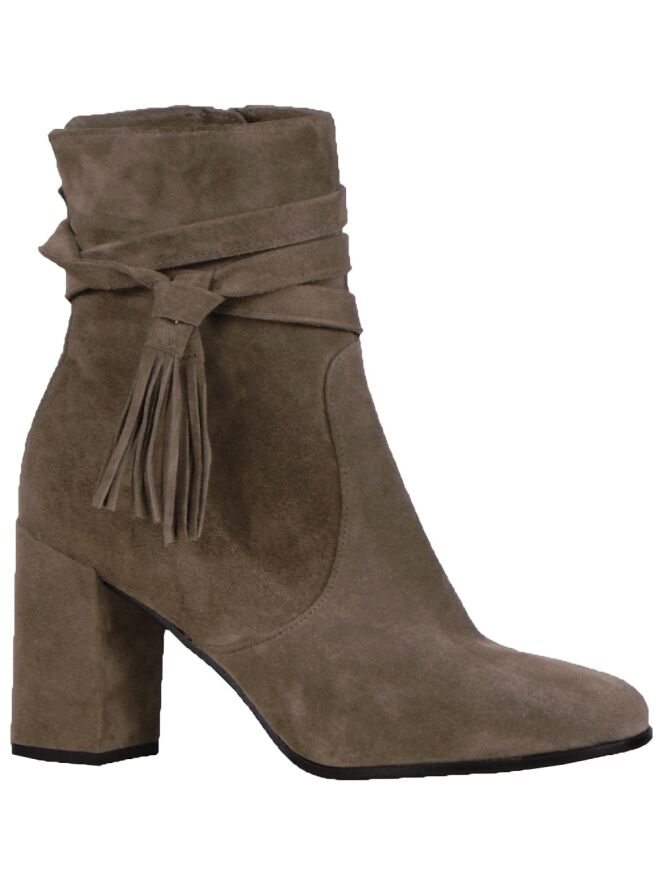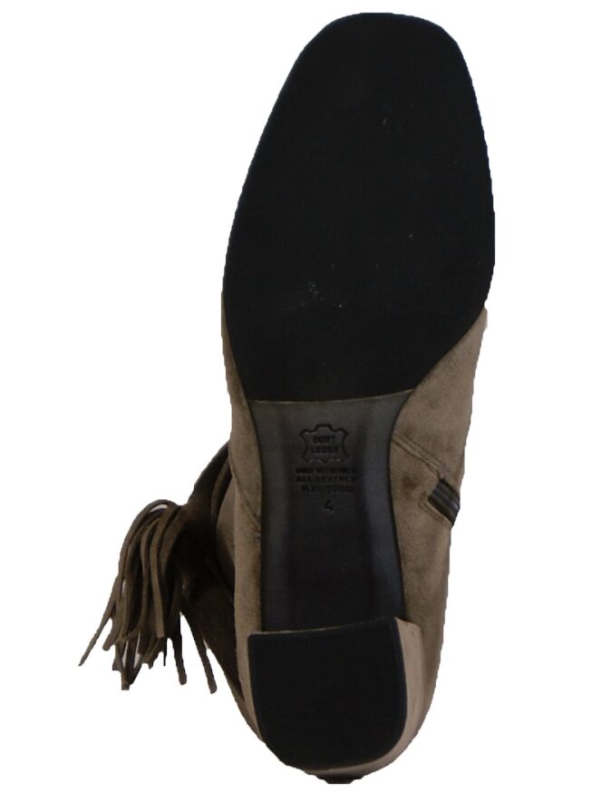 An ankle boot by the brand Kennel & Schmenger in the color brown. The boot has to the shaft 3 pipings with two tassels. On the inside is a zipper deployed. The round block heel is lined with suede in the same color as the ankle boot. This boot is unlined inside.