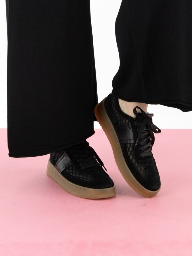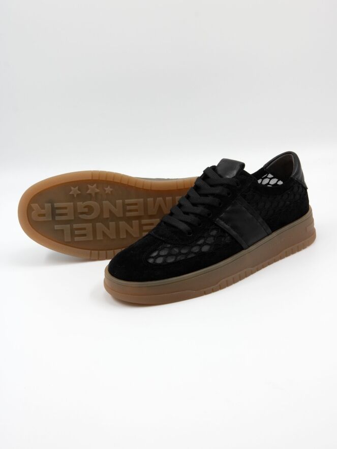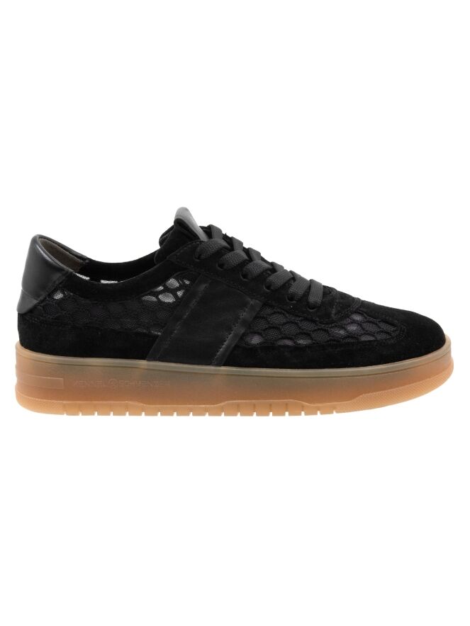 A low-top sneaker by Kennel und Schmenger in black. The sneaker is made from a transparent fabric with a diamond pattern. The toe cap and the trim above the sole are crafted from nubuck suede. A leather insert is placed on the heel. The sole has a honey-colored finish.
