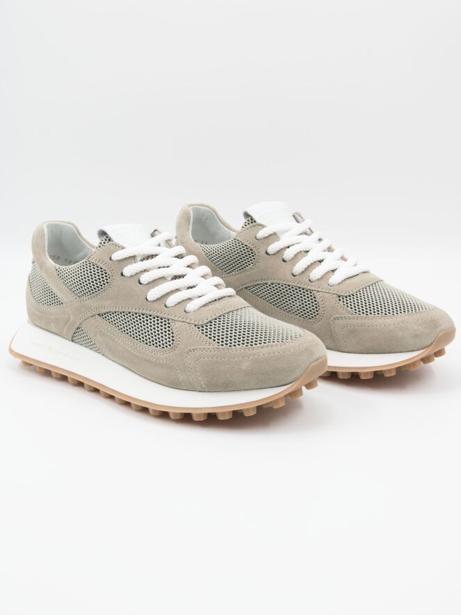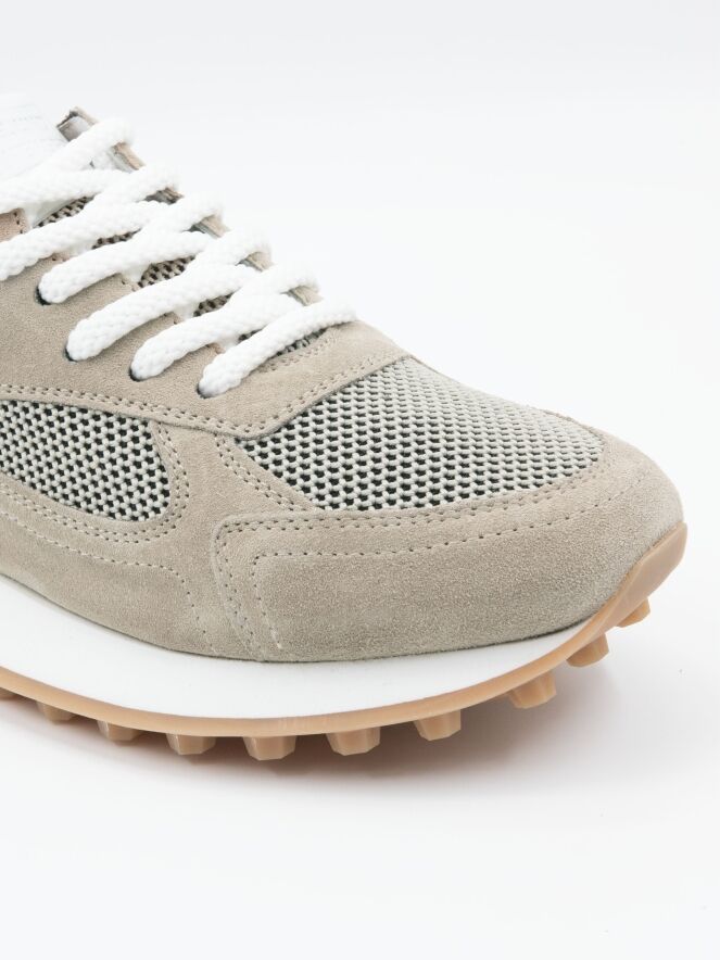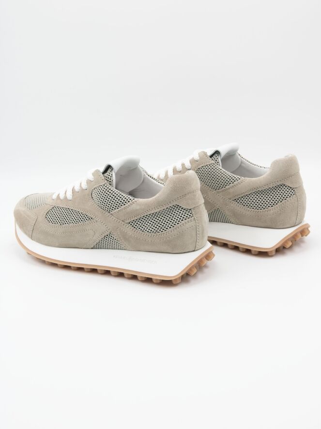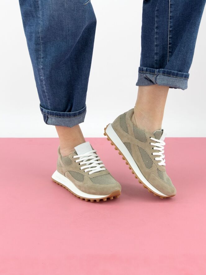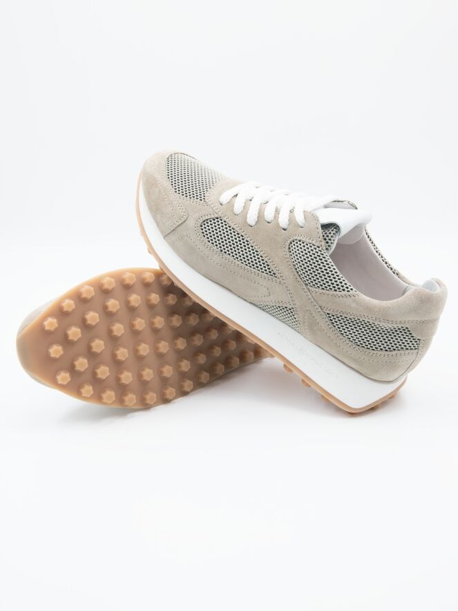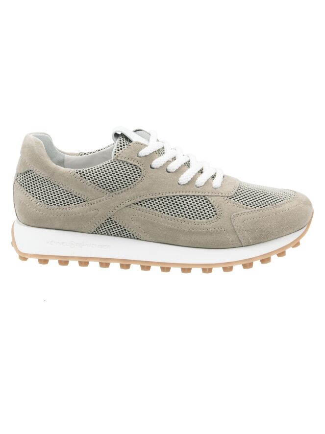 A luxurious sneaker from Kennel und Schmenger in sand color. The sneaker combines camoscio suede with an elastic fabric in a mesh structure. It features a white sole and white laces.