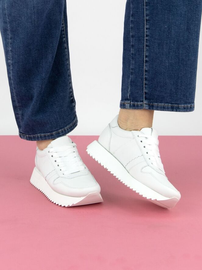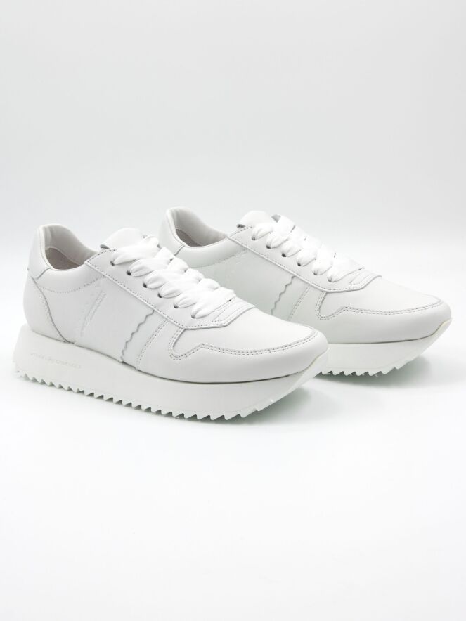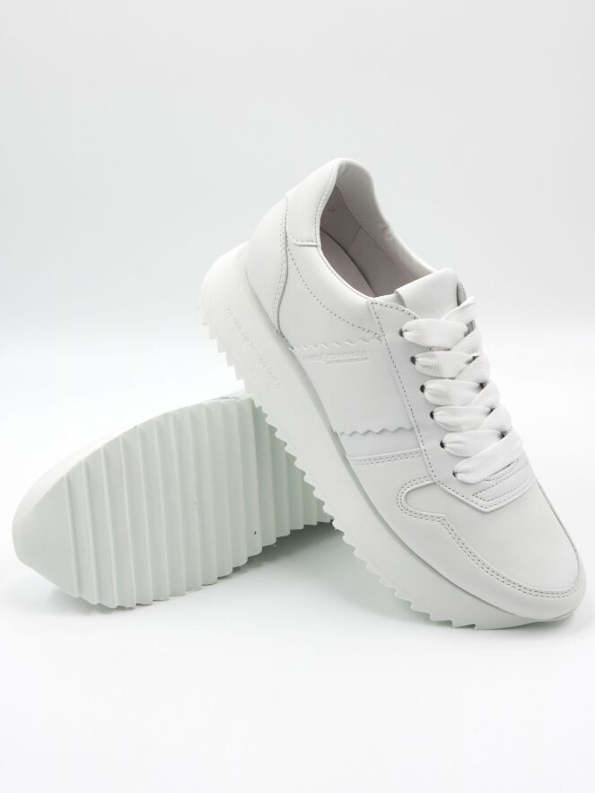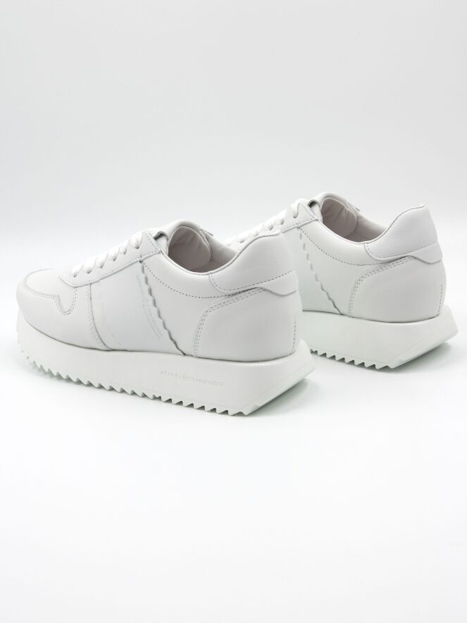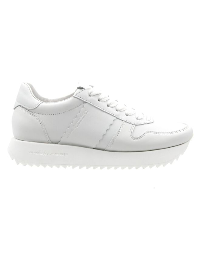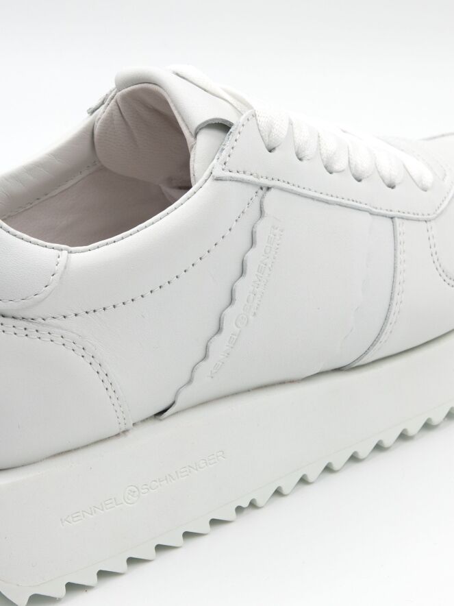 A sneaker by Kennel und Schmenger in white. The sporty sole has a fine serrated pattern on the bottom. The interior is lined with leather.