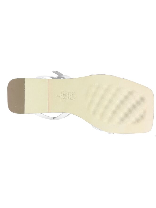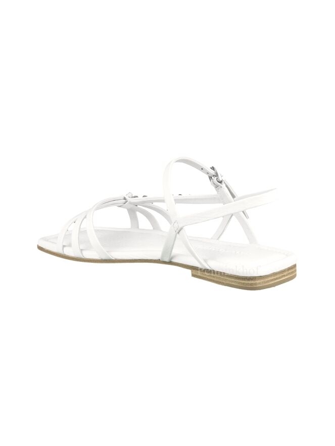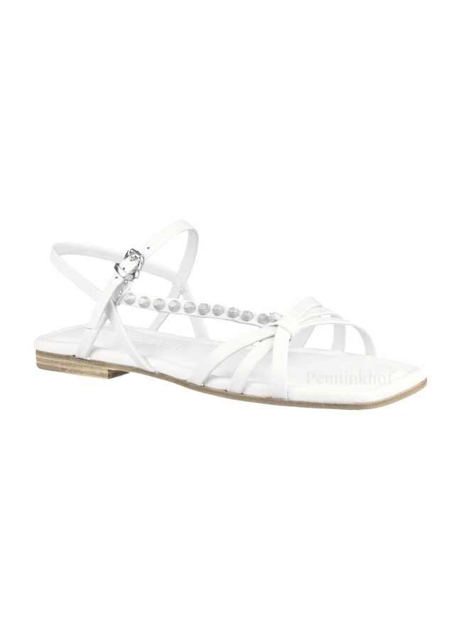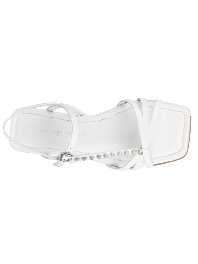 A sandal from Kennel & Schmenger in the color white. 3 narrow trims are crossed over the forefoot. On the outside of the foot is a narrow band with several silver-colored studs. The heel strap is adjustable. The sandal has a square toe.