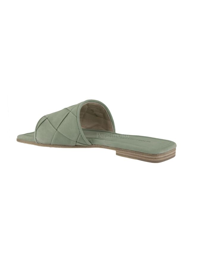 A slipper from Kennel & Schmenger in the color olive green. The wide band over the forefoot is braided. The flip flop has a square toe.