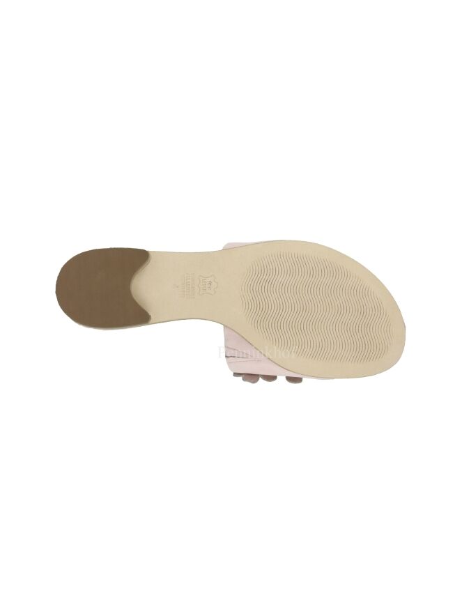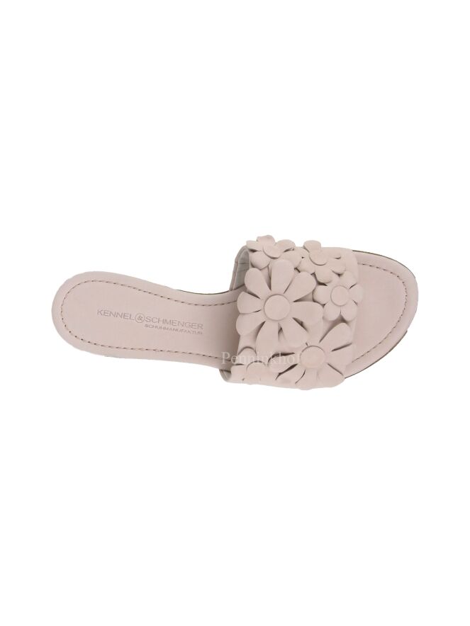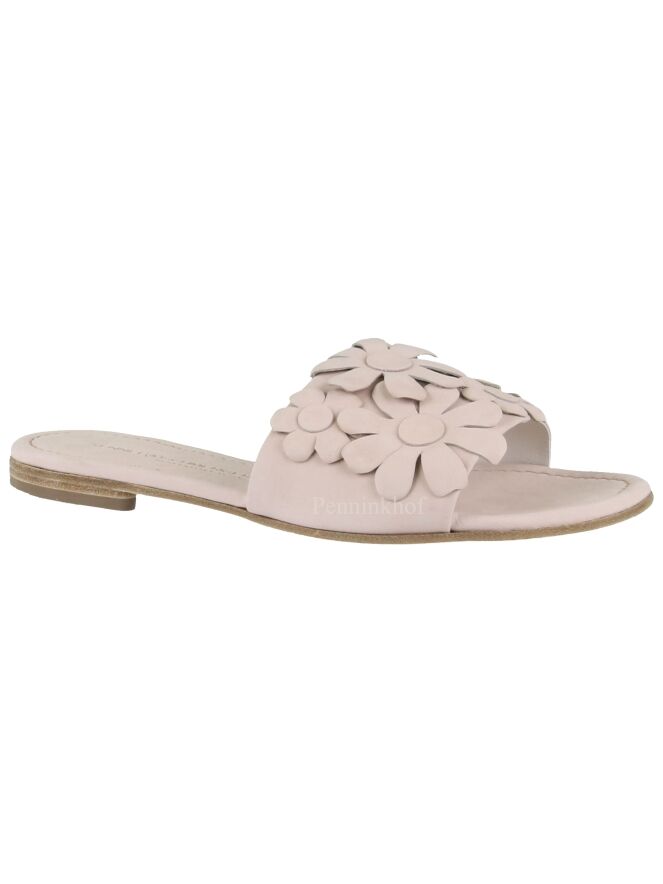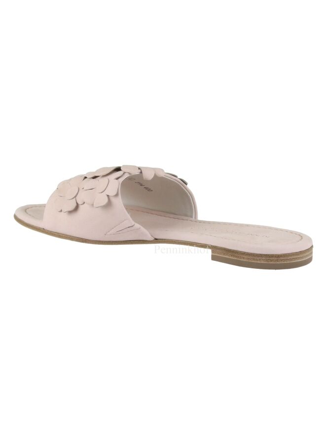 A slipper from Kennel & Schmenger in pastel pink. on the wide band over the forefoot are decorative flowers. The slipper has a round nose.