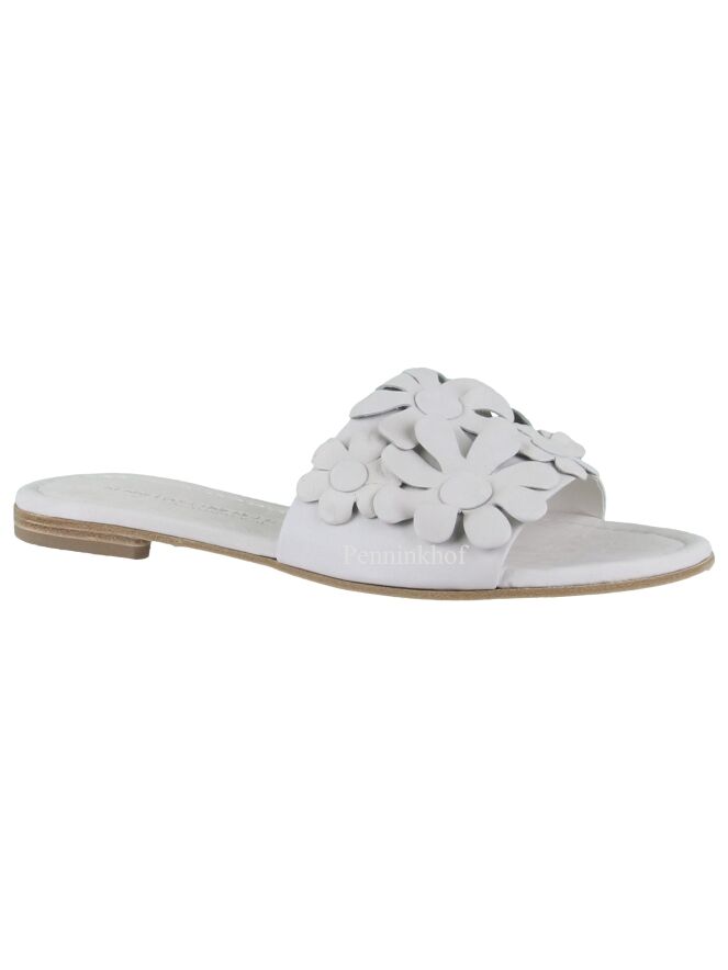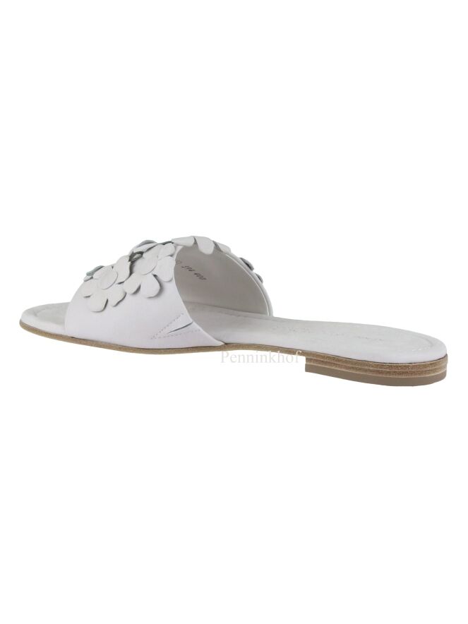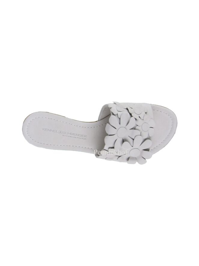 A flip flop from Kennel & Schmenger in the color light gray. on the wide band over the forefoot are decorative flowers. The slipper has a round nose.