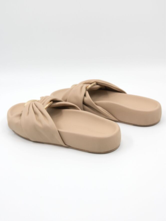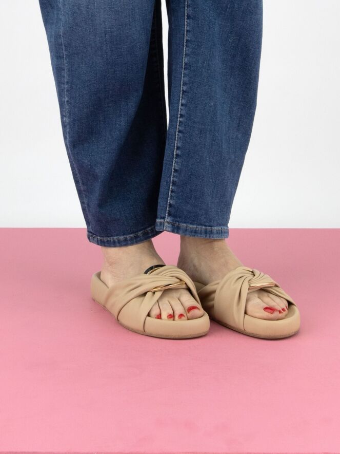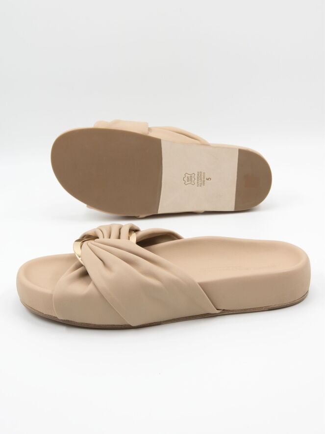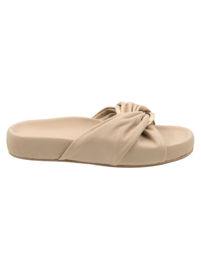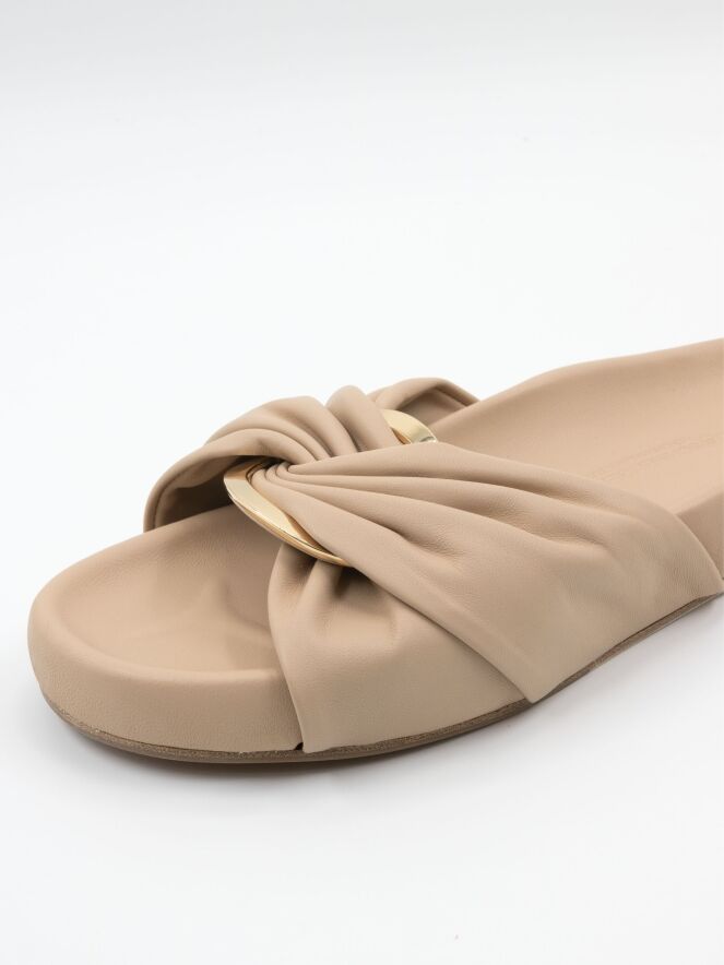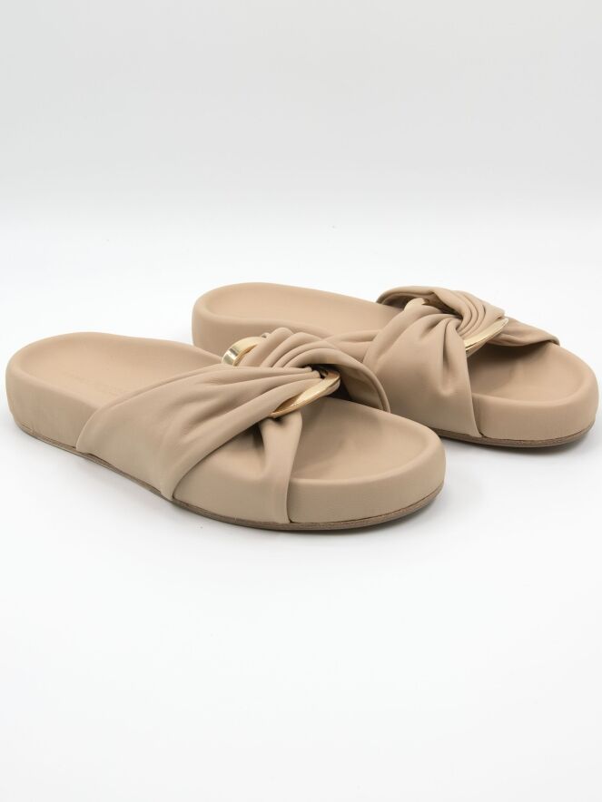 A luxurious slipper by Kennel und Schmenger in beige. At the center of the leather strap over the forefoot is an oval, gold-toned buckle. The soft footbed is in the same color as the leather.
