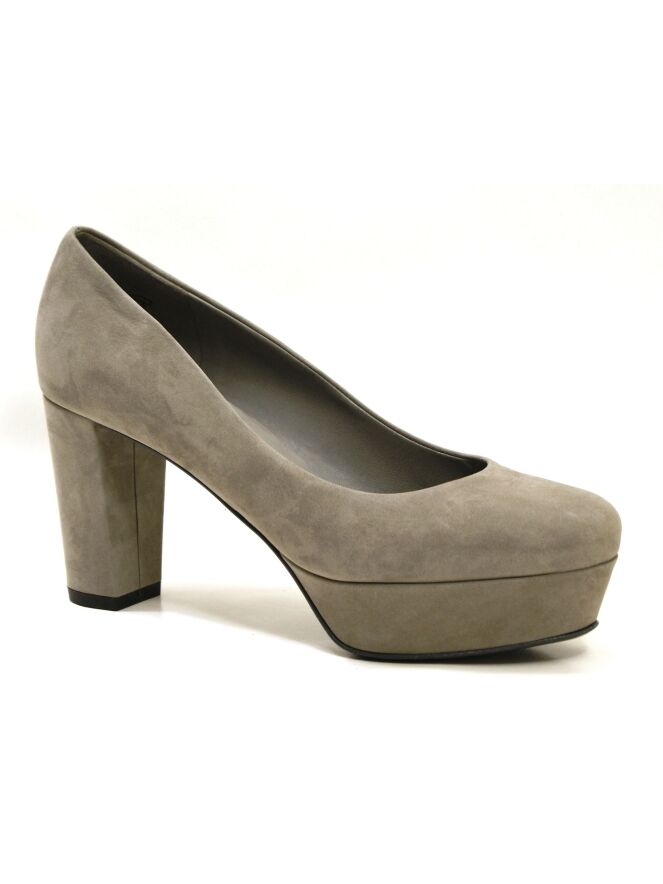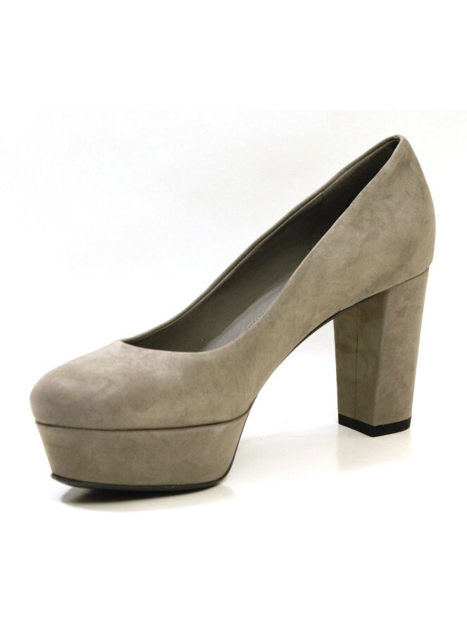 A pump of the brand K & S in a taupe color on a platform sole. The toe is round and the pump has a block heel which is covered in the same material as the pump itself