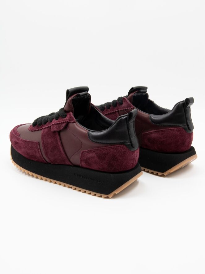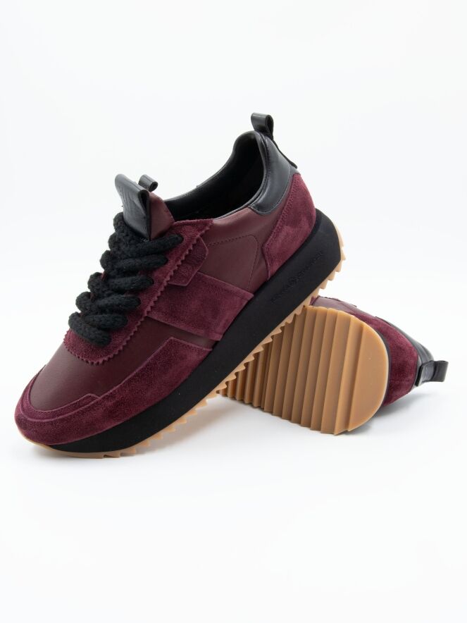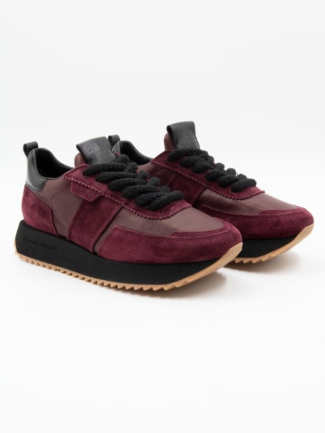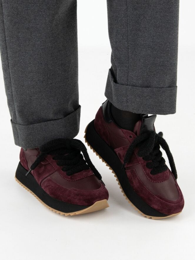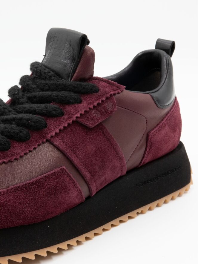 A sneaker from Kennel & Schmenger in aubergine. The forefoot and the sides around the shaft are crafted in leather, while the toe, heel, and the lace area are finished in suede. The serrated sole is black with honey-colored detailing, adding a sporty touch. The sneaker comes with black laces and is fully lined with leather on the inside.