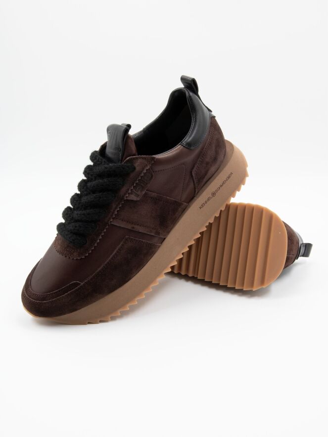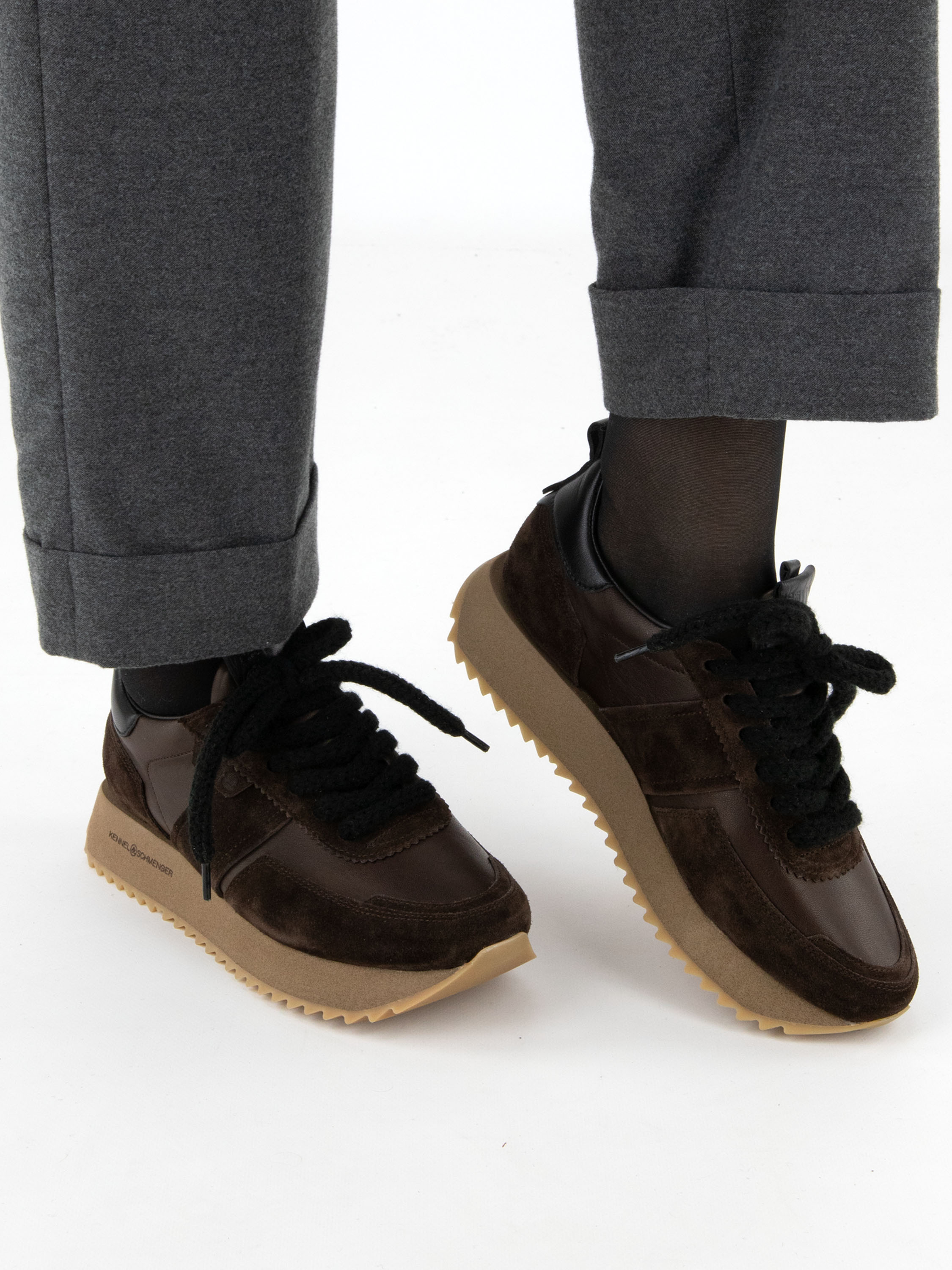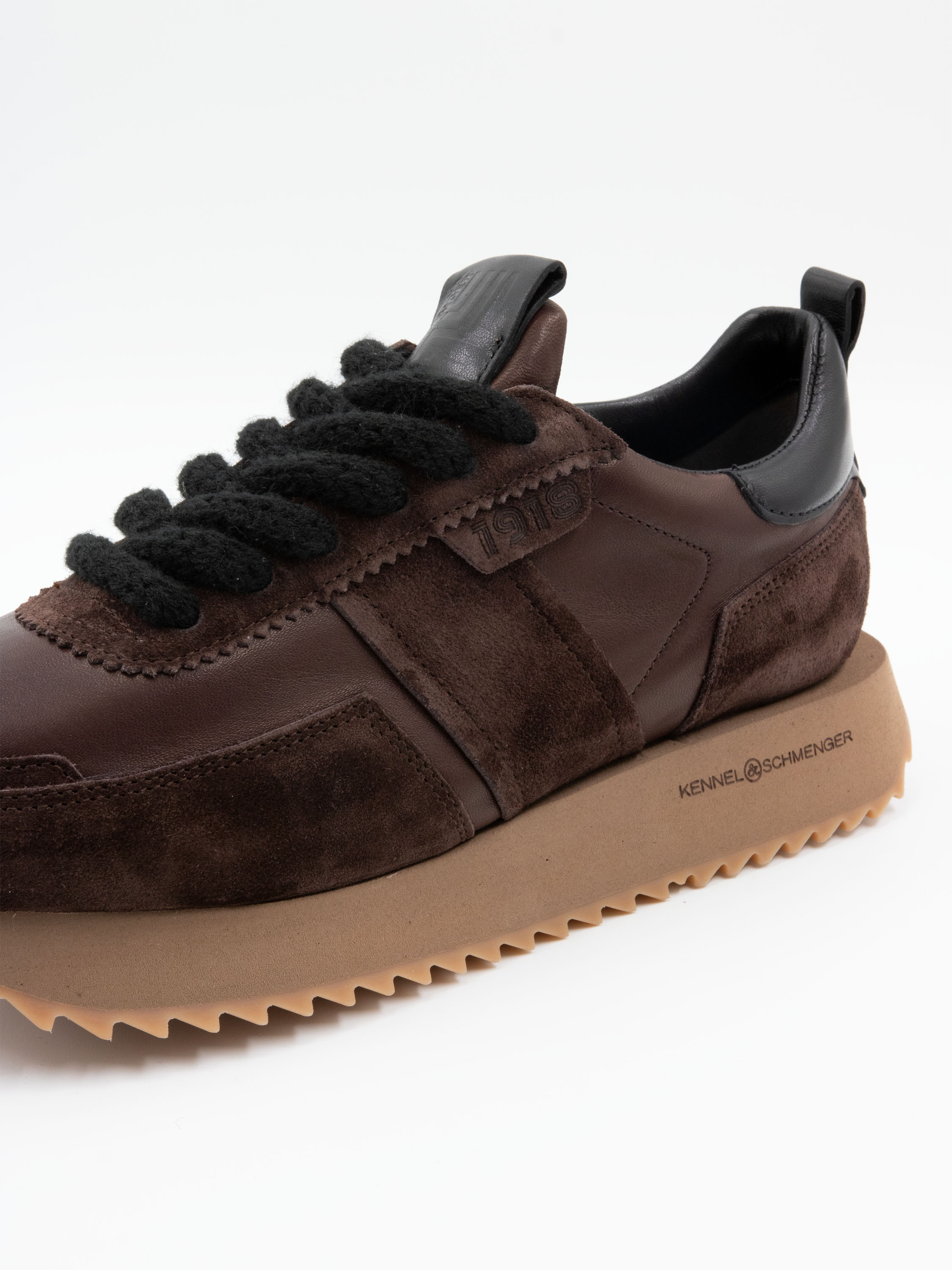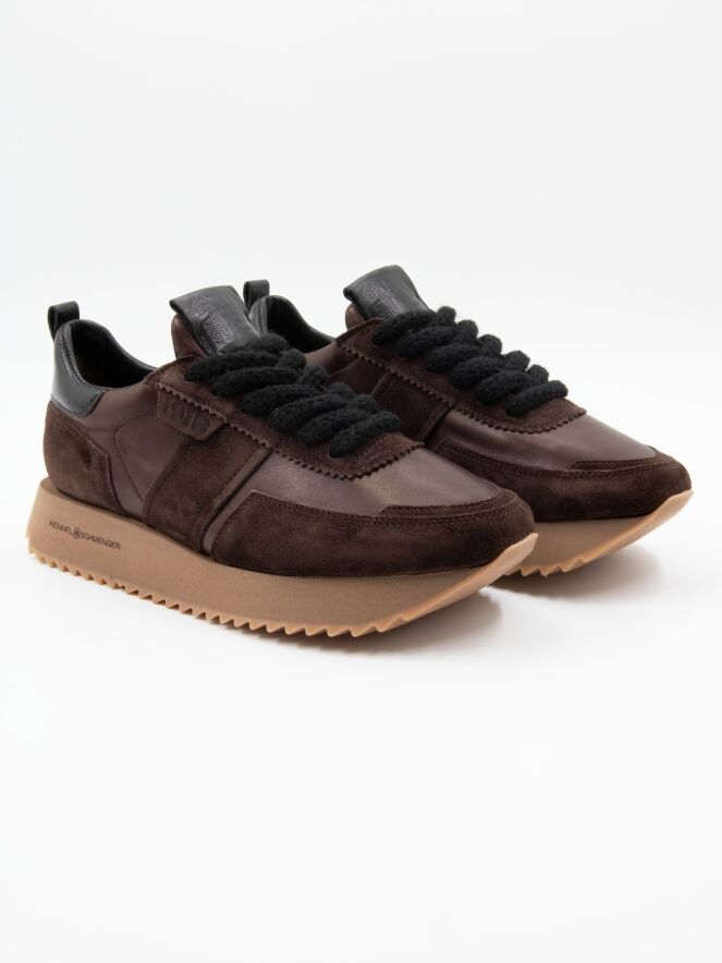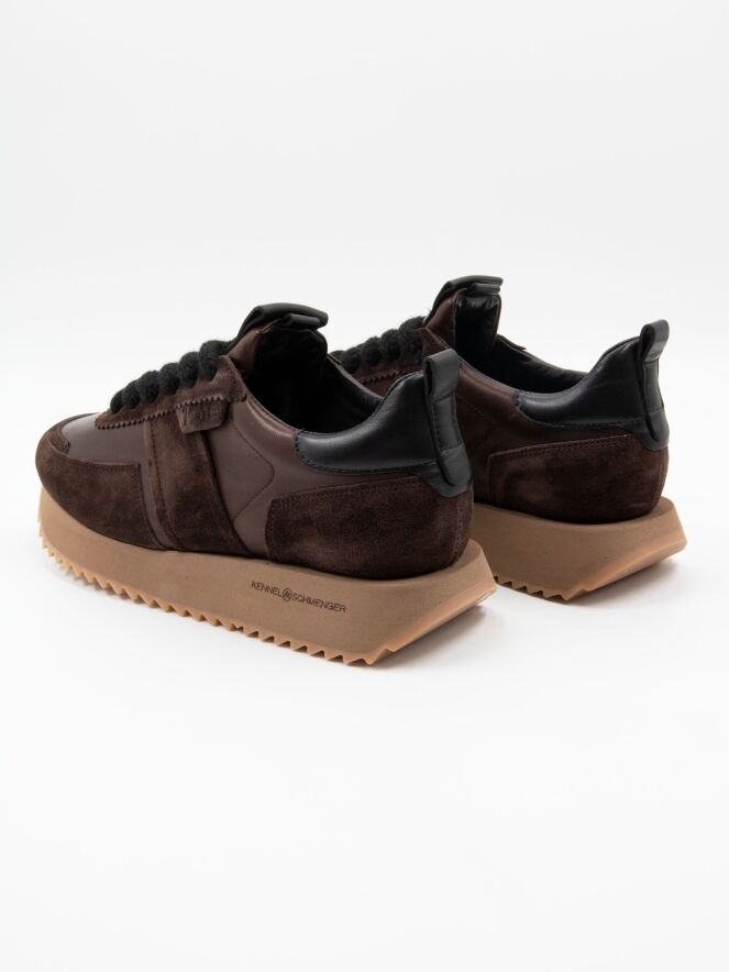 A sneaker from Kennel und Schmenger in mocha brown. The forefoot and the sides around the shaft are crafted in leather, while the toe, heel, and lace area are finished in suede. The serrated sole comes in a honey shade, adding a sporty touch. The sneaker is finished with black laces and a fully leather-lined interior.