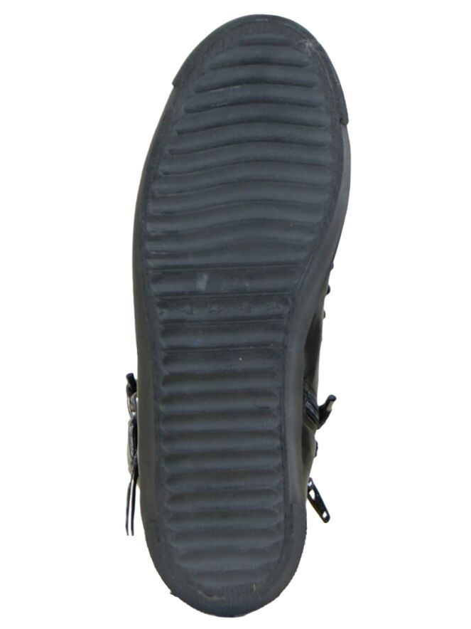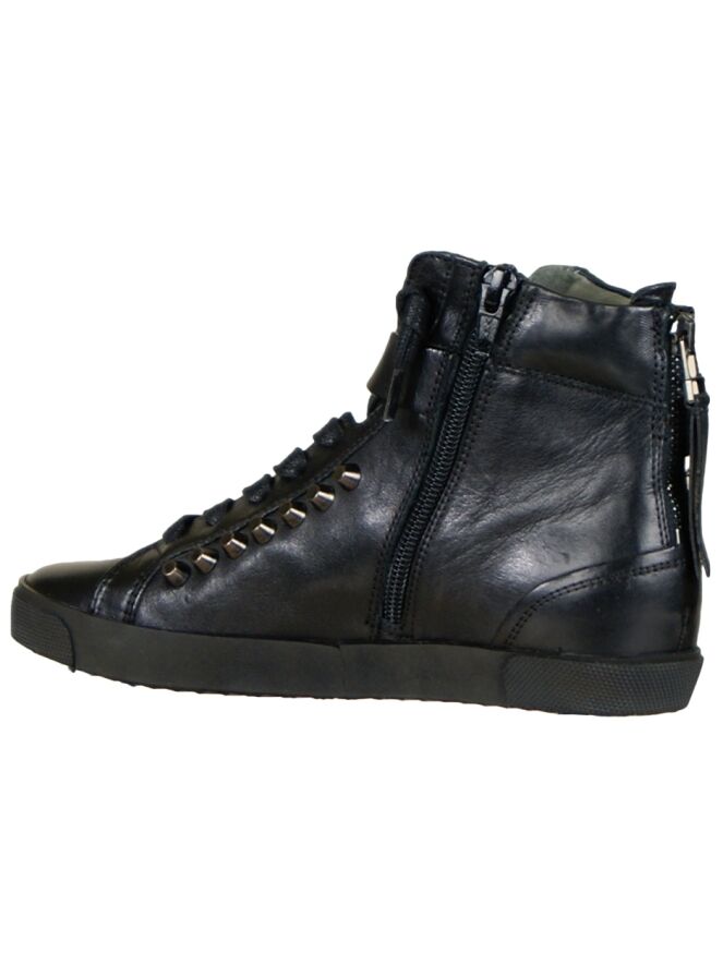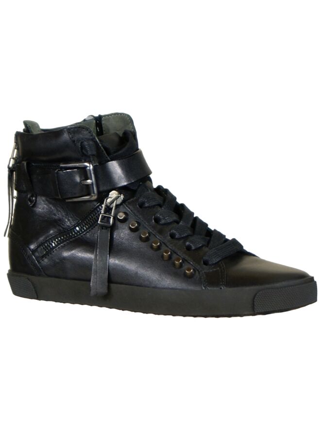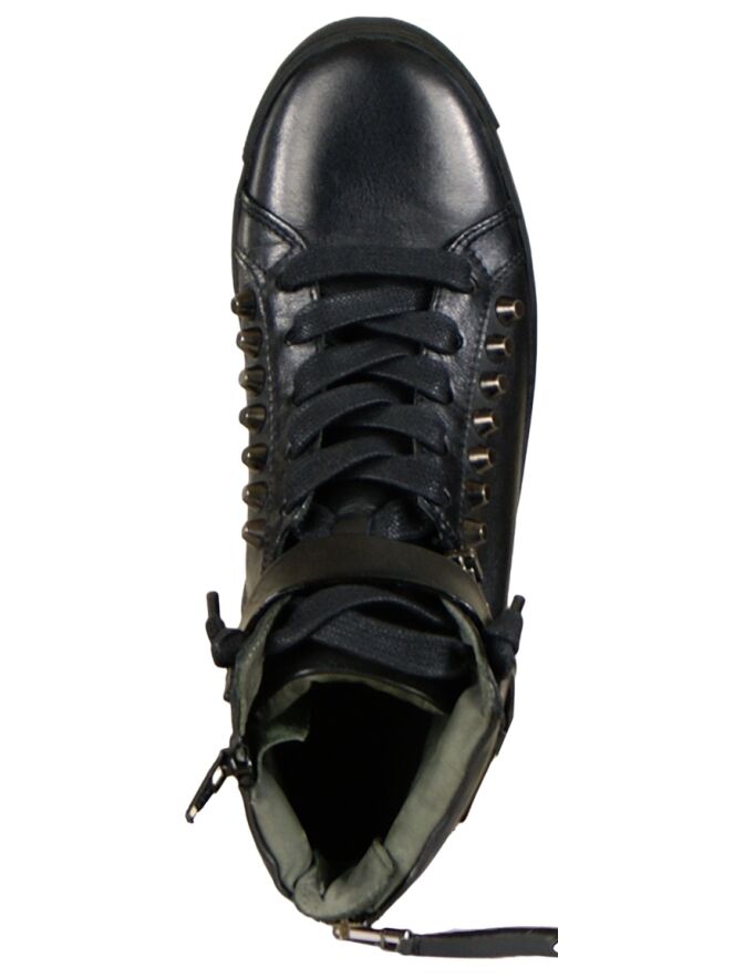 A high sneaker from Kennel & Schmenger in the color black. Along the laces are decorative studs. On the outside there is a strap with a silver colored buckle along the shaft. There is a zipper on the heel. The inside is lined with leather.