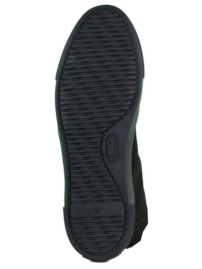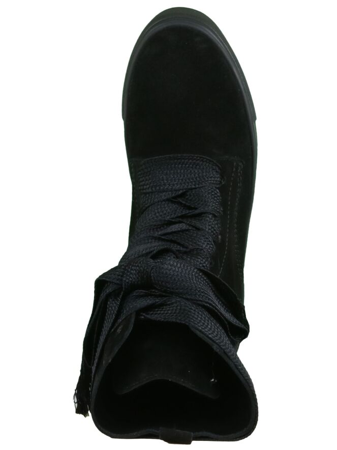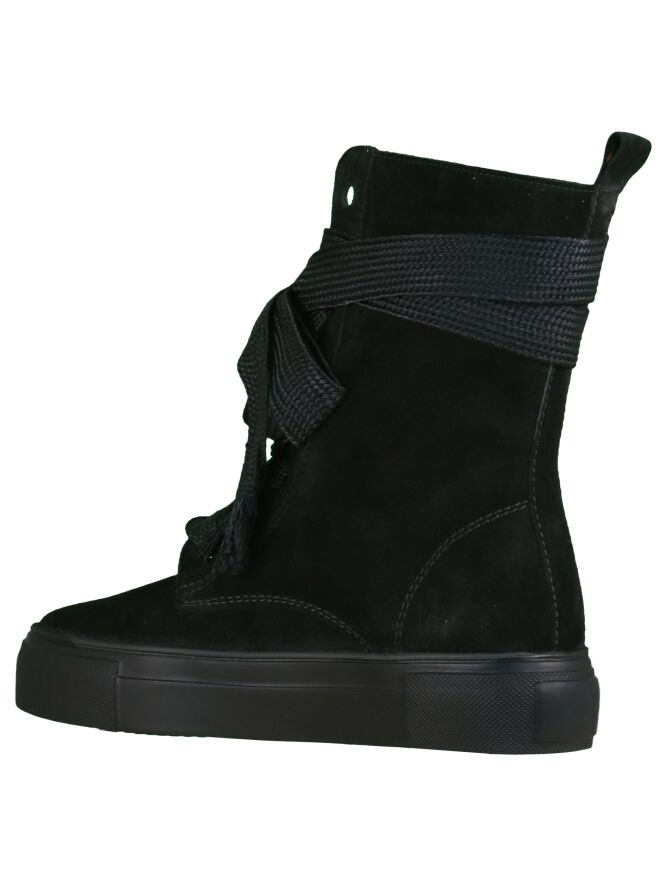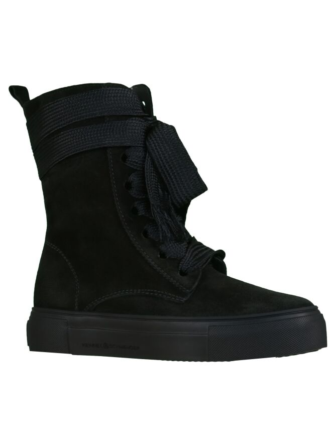 A high sneaker of the Kennel & Schmenger brand in the color black. The flat rope is extra long and can be knotted around the shaft. The sneaker has a black sole and is lined with leather on the inside.