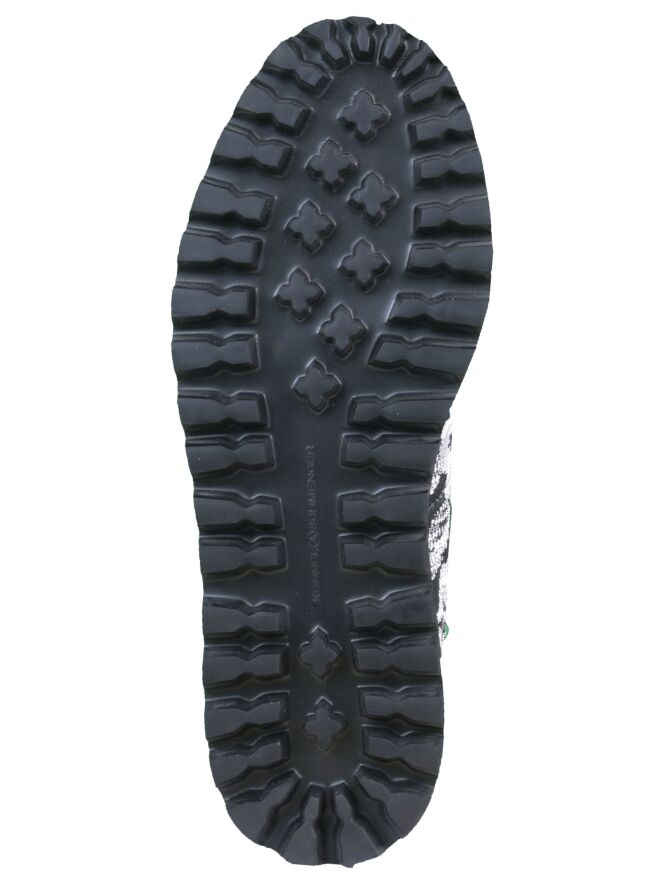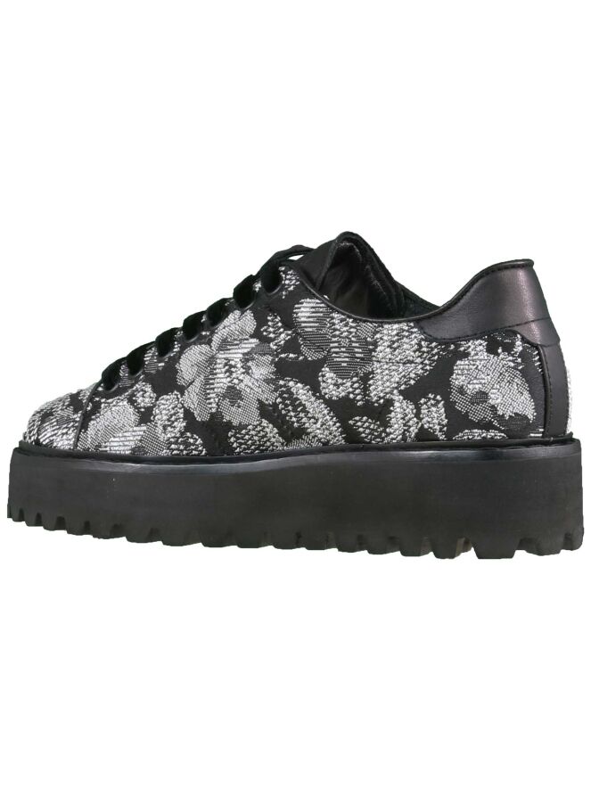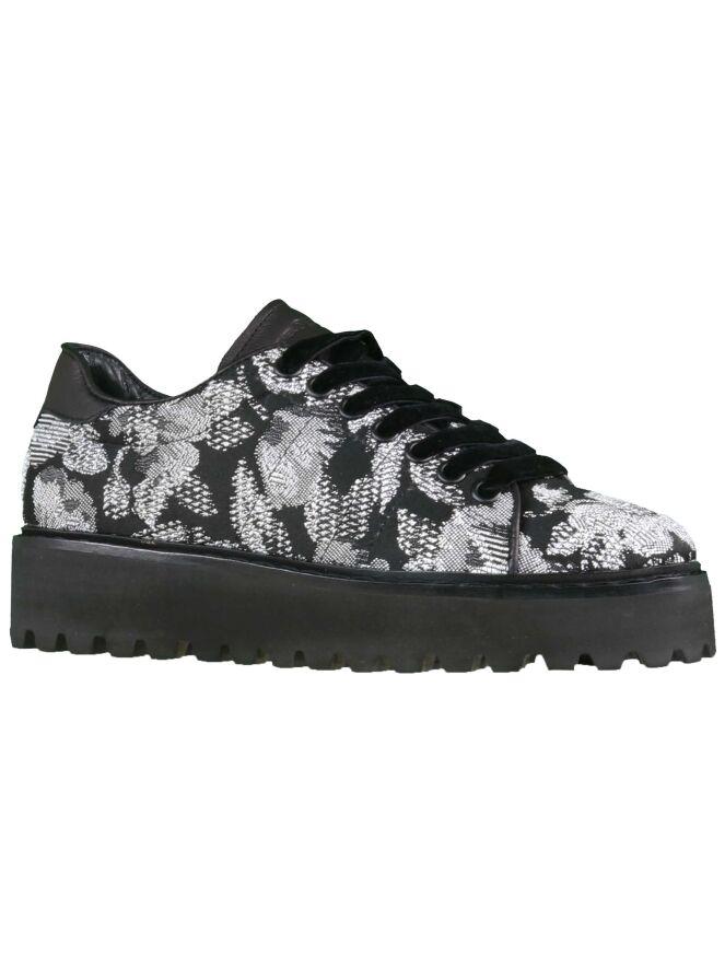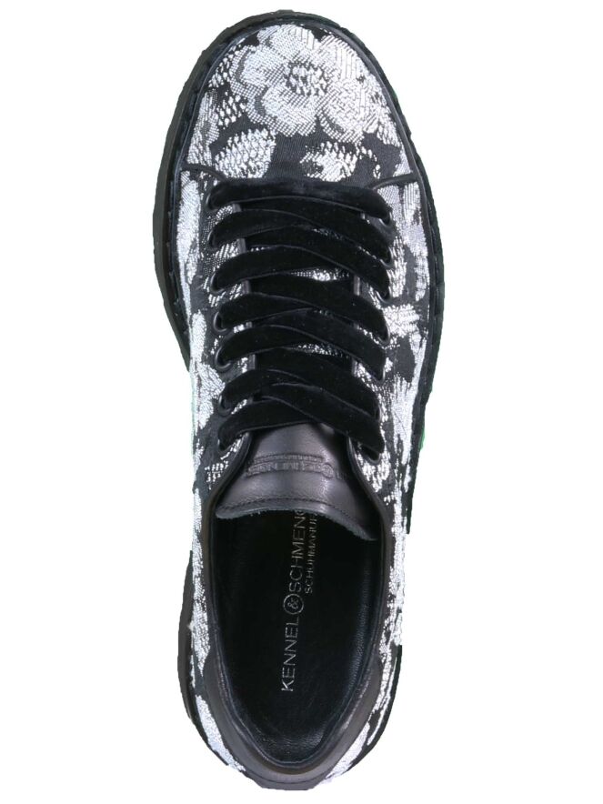 A loafer of the brand Kennel & Schmenger in a graphic floral print with the colors black and white. The laces are made from a velvet fabric. Along the edges of the fabric are narrow leather piping. The sole is jagged. The inside is lined with leather.