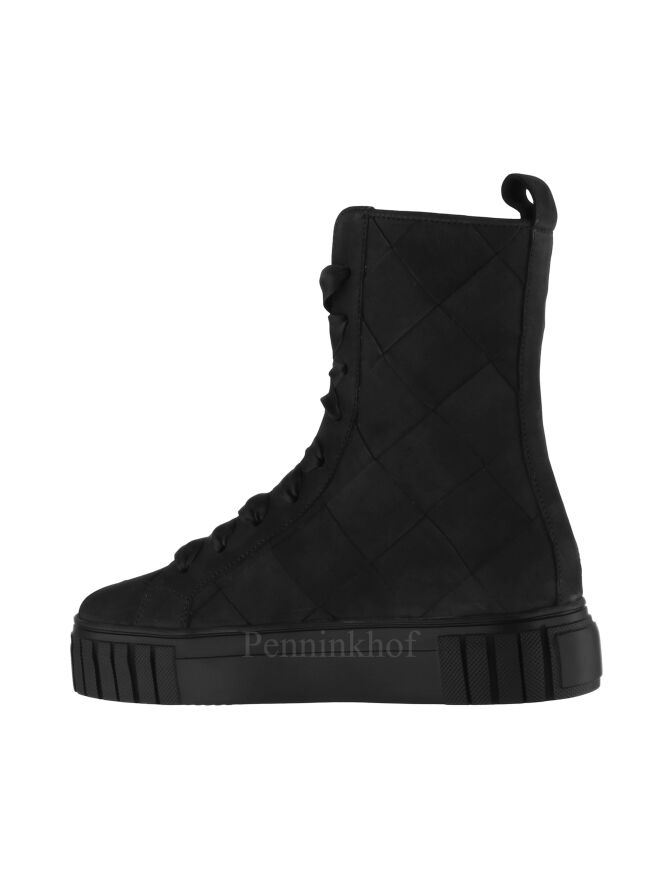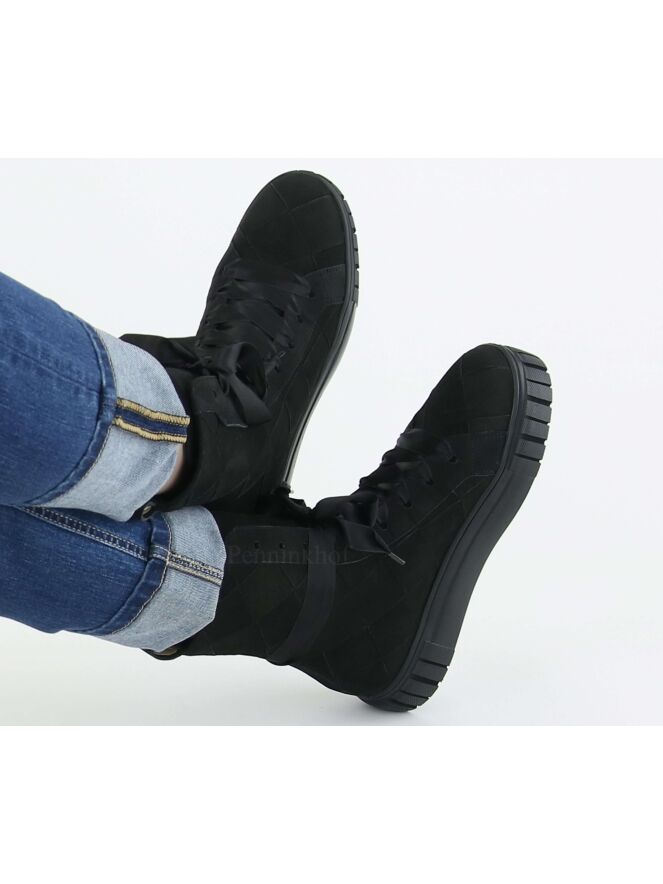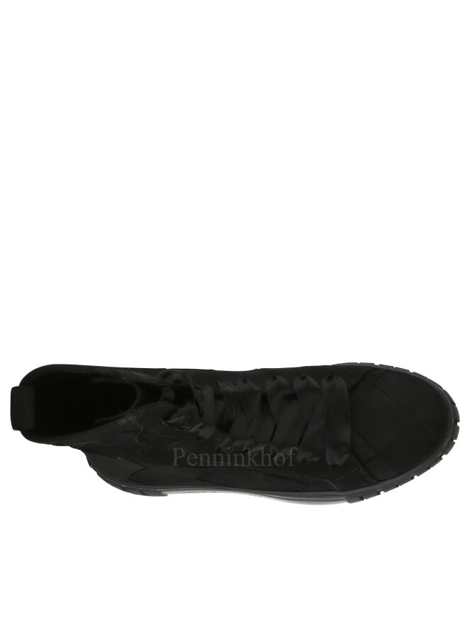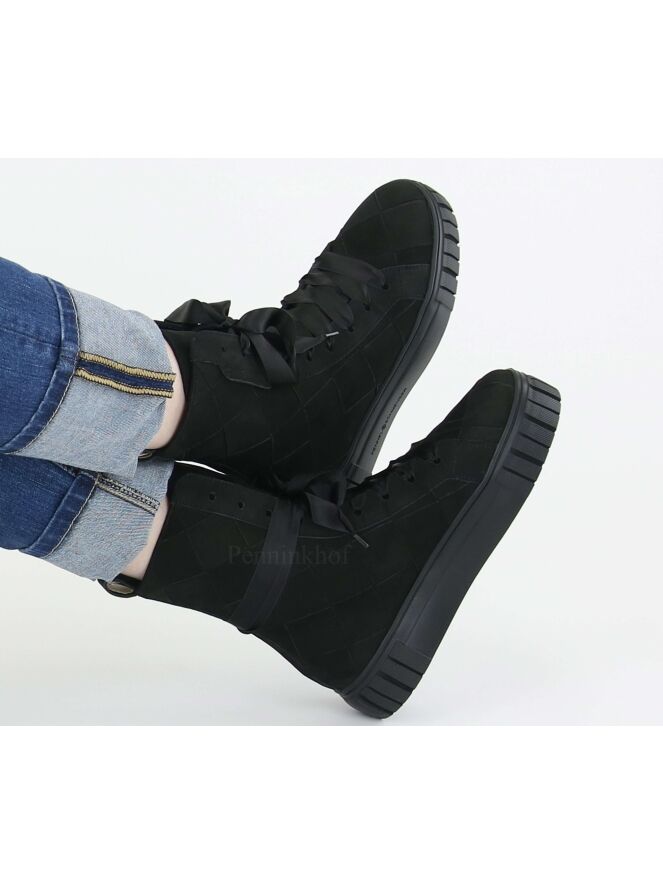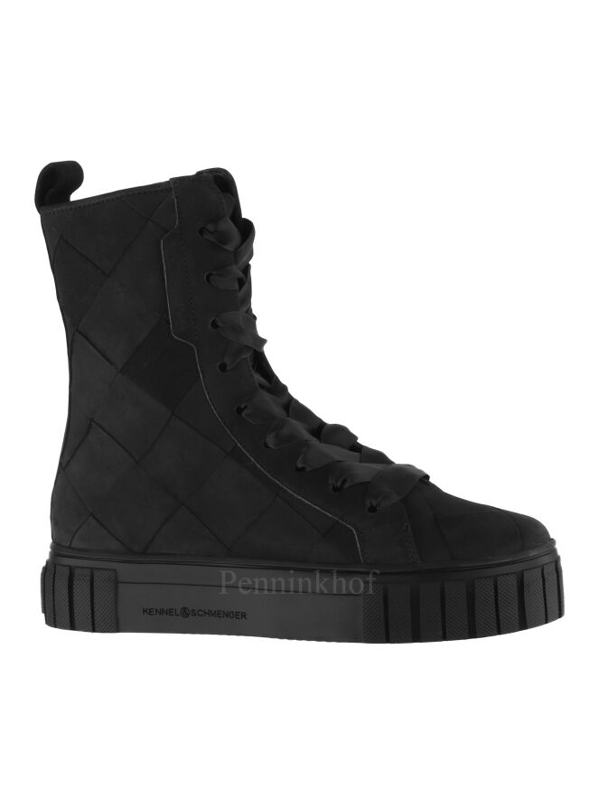 A high sneaker from Kennel & Schmenger in the color black. The leather is in a braided pattern. The laces are made of a matte satin fabric. The inside is lined with leather and the insole is removable.