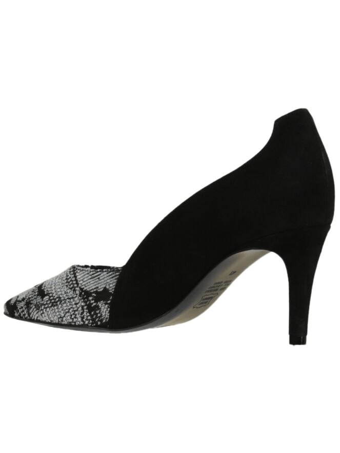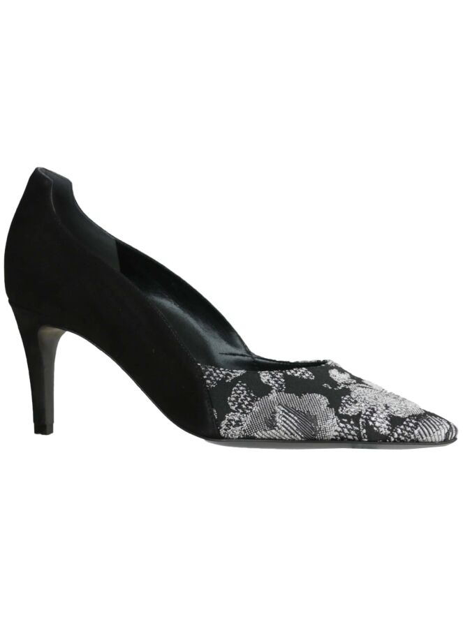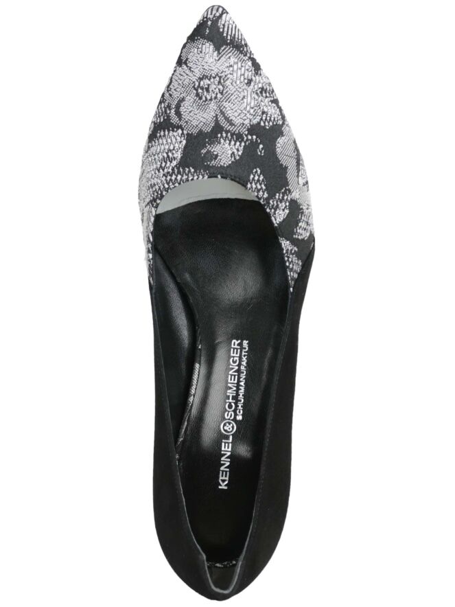 A pump of the brand Kennel & Schmenger in the color black. The forefoot of the pump is in a matte satin fabric with a lace print. The toe is slightly pointed and the inside of the pump is lined with leather. The slim cut heel is covered in the same material as the pump. This pump belongs at the bag with the item number: 404003354