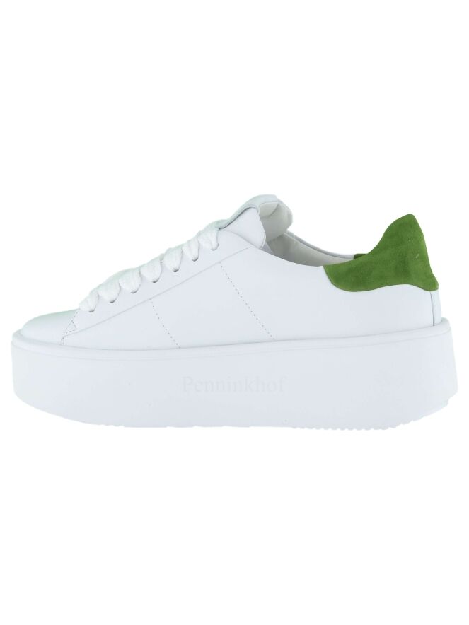 A sneaker from Kennel & Schmenger in the color white. A green piece of nubuck has been processed on the heel. The platform sole is in the color white. The inside is lined with leather.