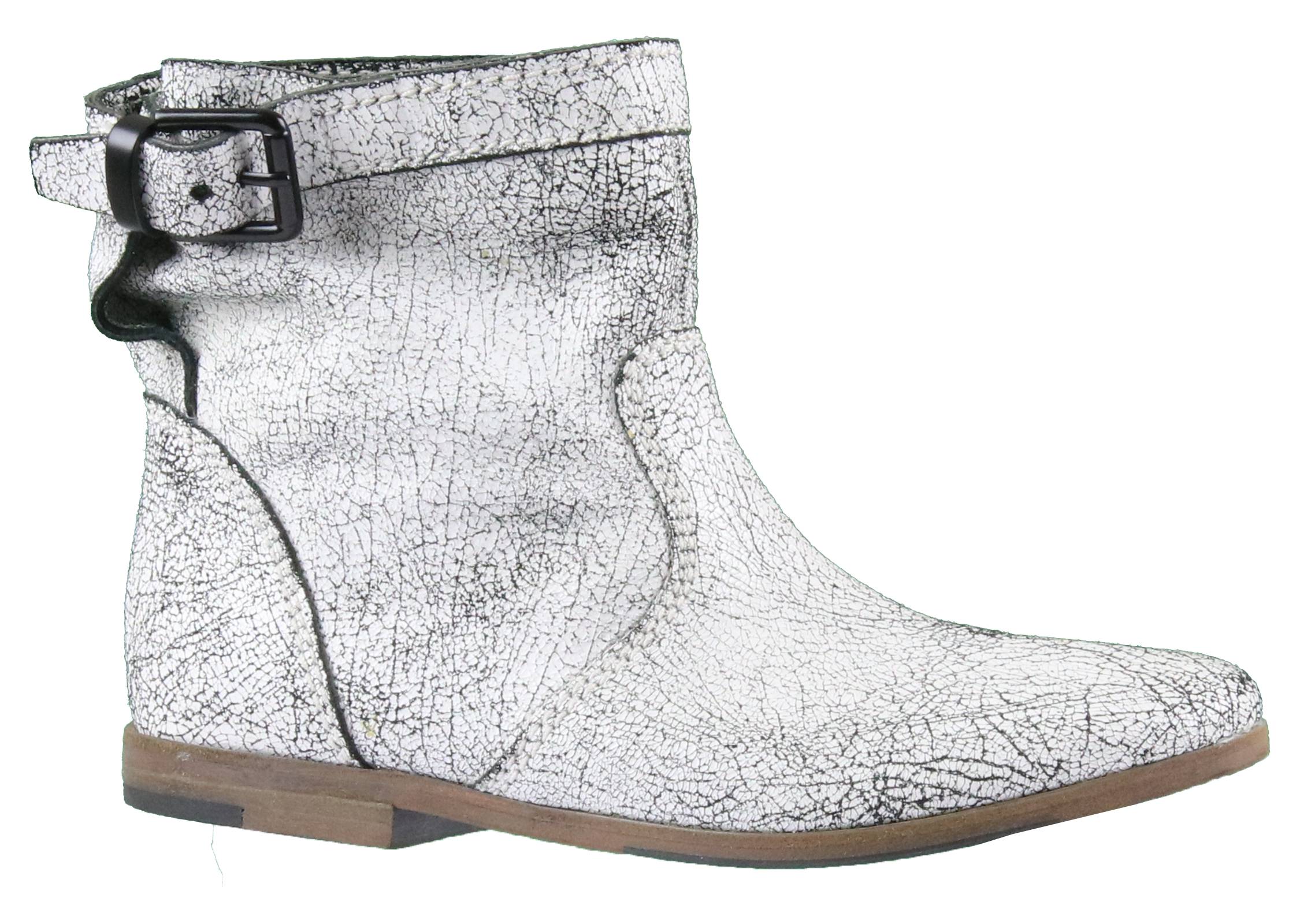 This ankle boot from K&S is made from supple calf leather and comes in a wrinkled matte white color. At the top of the short shaft is a buckle on the outside. The inner lining of this short boot is made of leather.