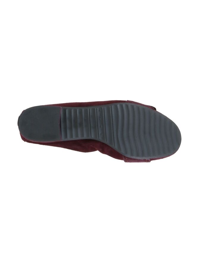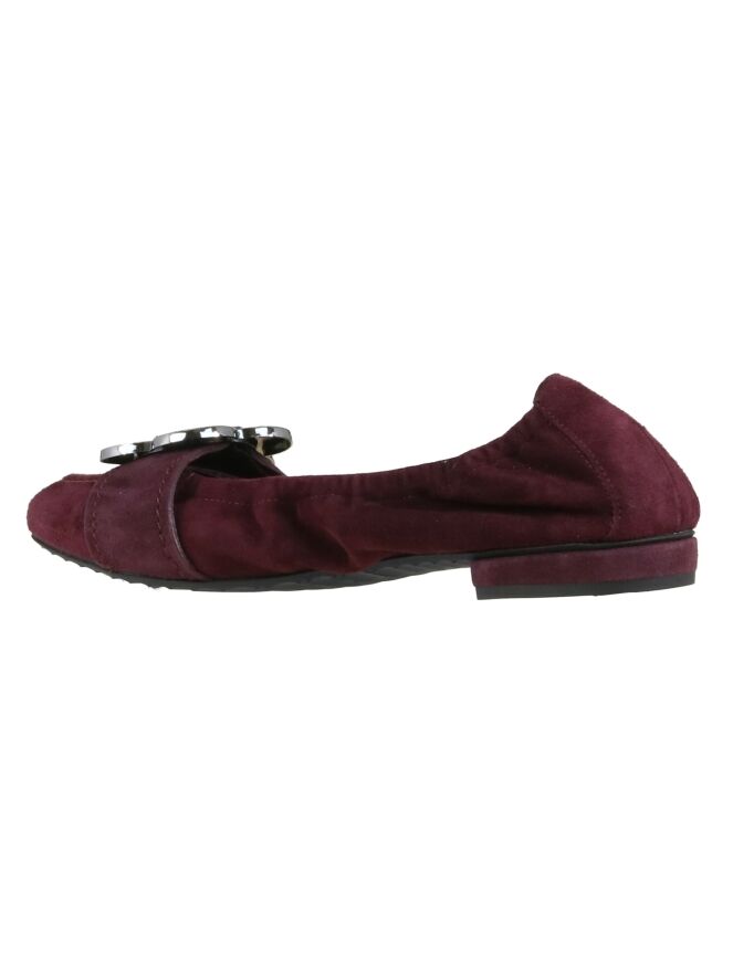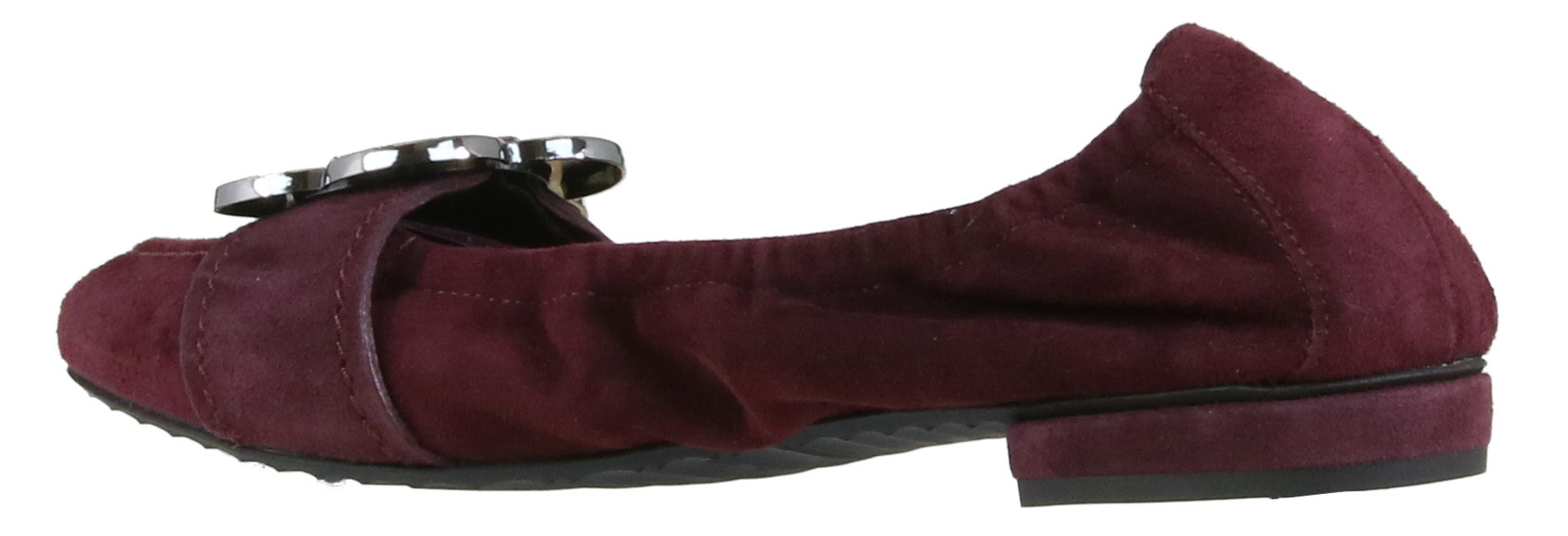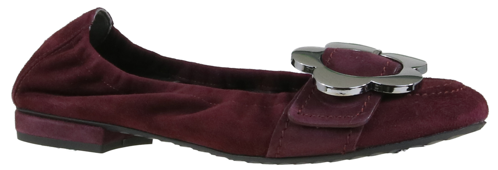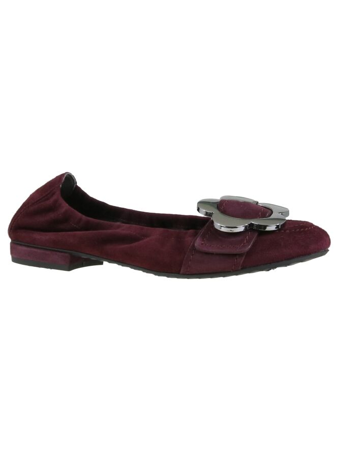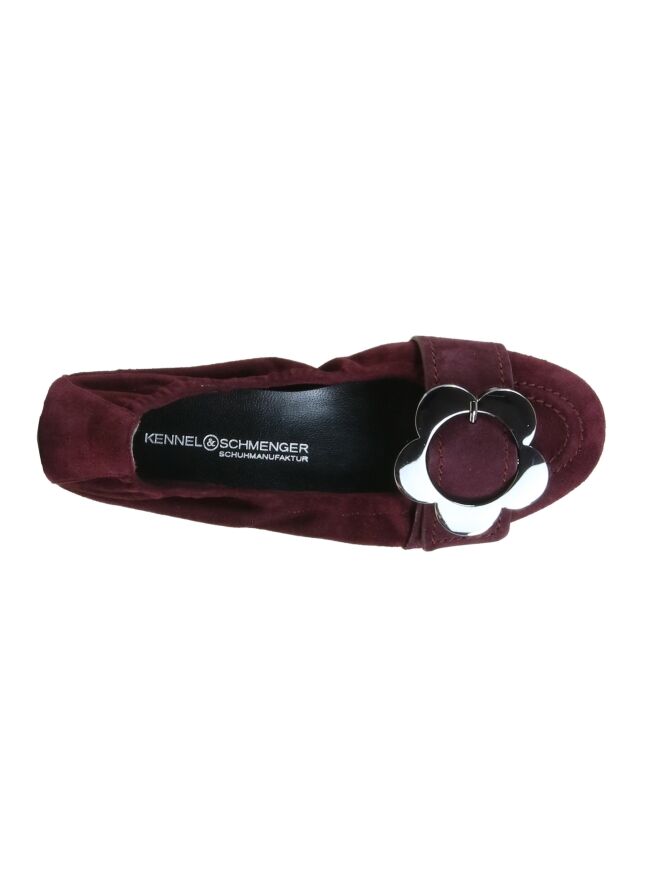 A ballerina by Kennel & Schmenger in the color burgundy red. A nickel-colored clasp in the shape of a large flower is placed over the forefoot. Elastic is on the edges of the sides. The inside is unlined.