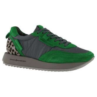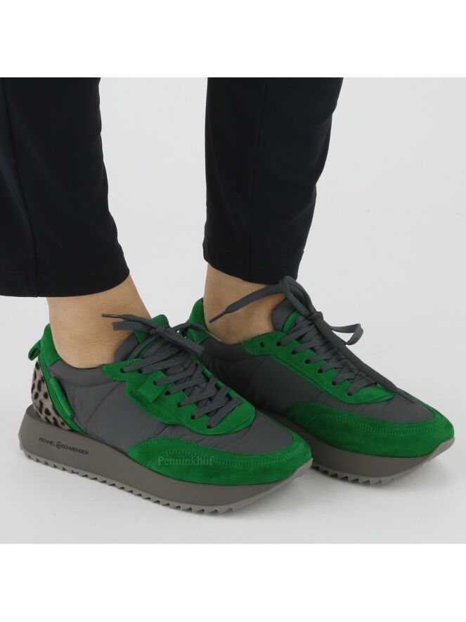 A sneaker from Kennel & Schmenger in the color green with gray. Along the laces, bottom edge along the forefoot and the nose are in a green nubuck suede. The forefoot and sides are in a gray parachute fabric and the heel is in shaved fur in a leopard print. The sole is finely serrated and built up in 2 layers with the colors light and dark grey. The inside is lined with leather.