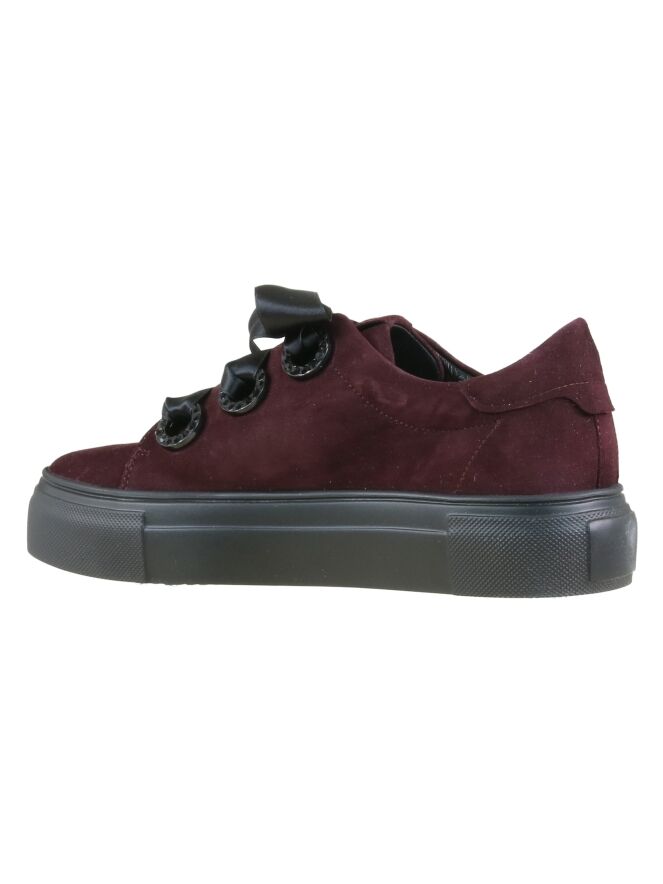 A luxury sneaker from Kennel & Schmenger in the color burgundy red. The vet holes have decorative black rings with rhinestones. The lace is made of mat satin ribbon. The inside is partly lined with leather.