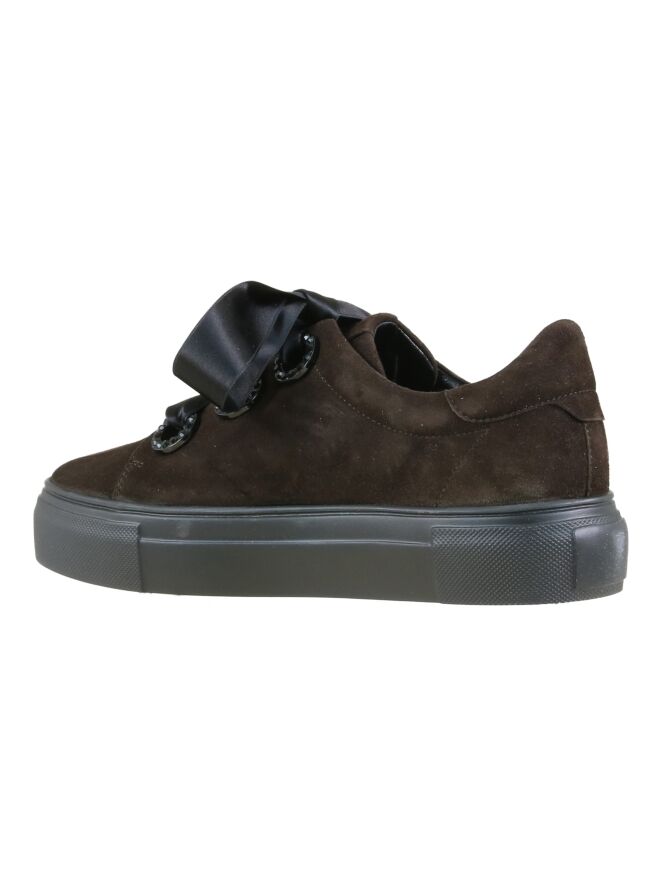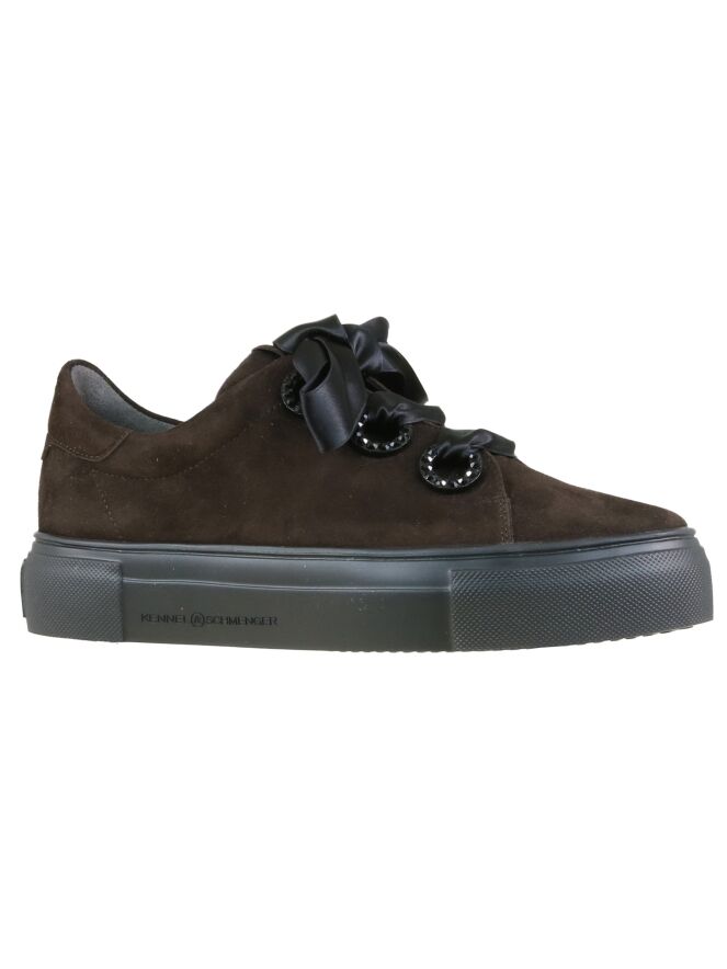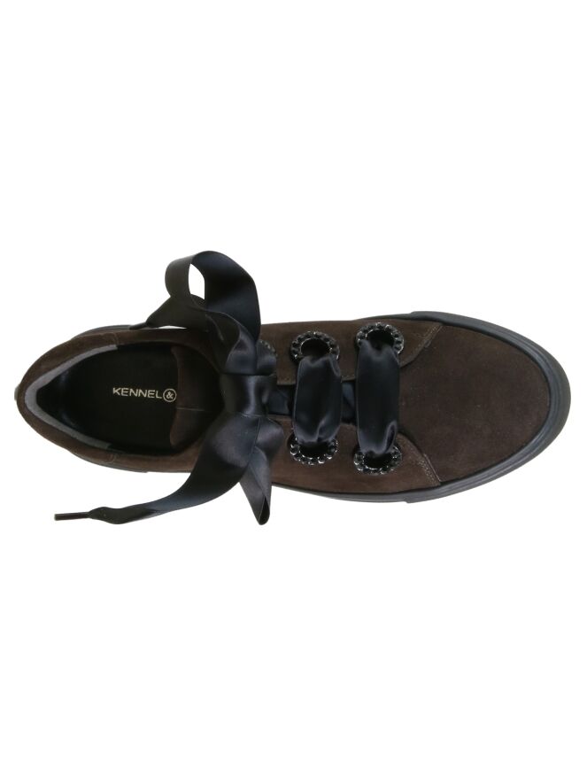 A luxury sneaker from Kennel & Schmenger in the color mocha brown. The vet holes have decorative black rings with rhinestones. The lace is made of mat satin ribbon. The inside is partly lined with leather.