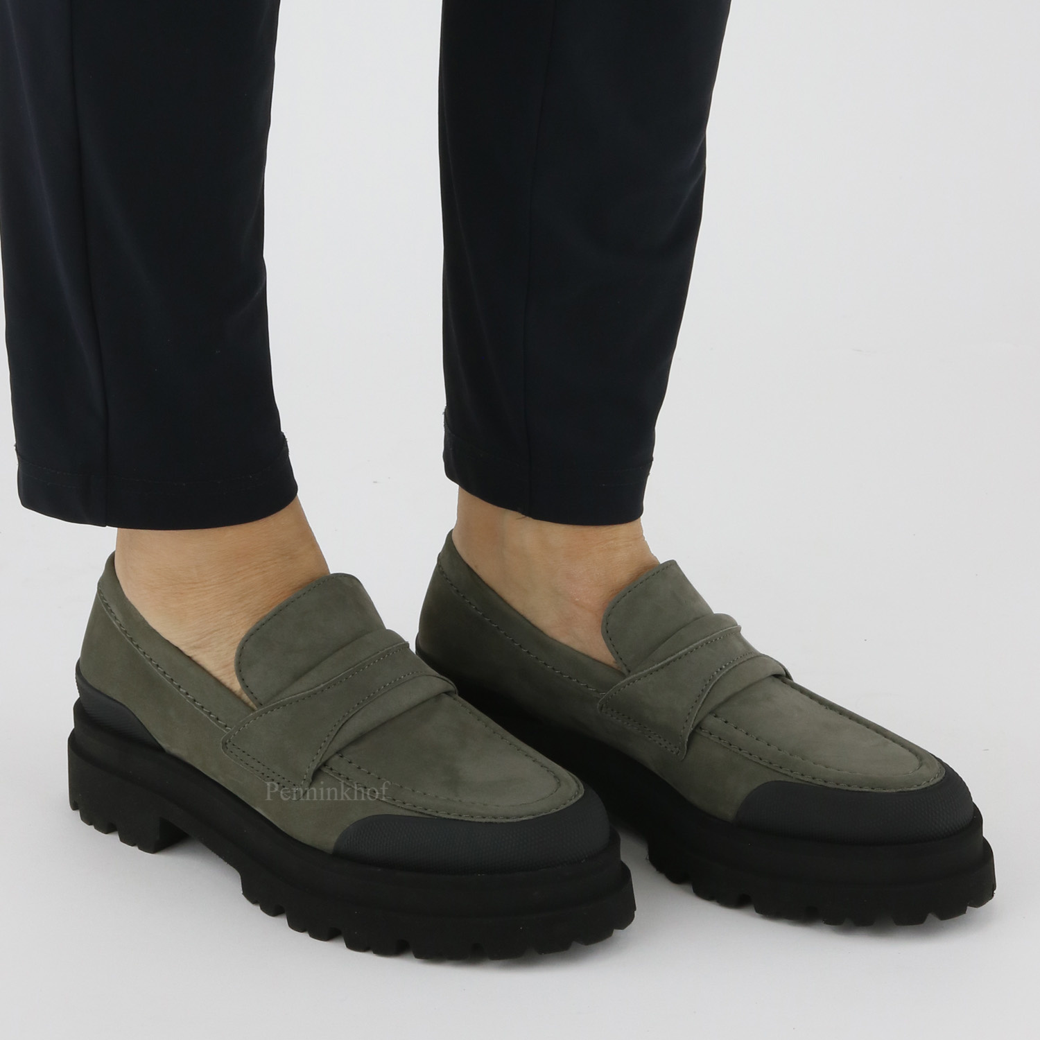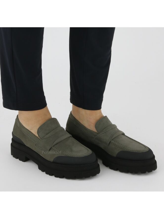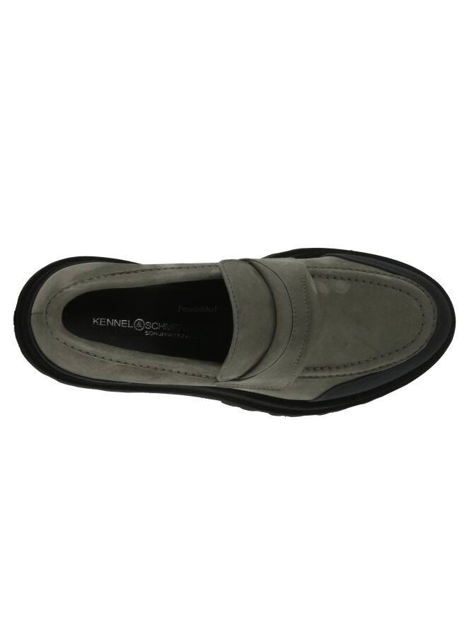 A loafer from Kennel & Schmenger in the color gray. The edge of the nose has a wide ribbed black trim. The sturdy sole is serrated. The inside is lined with leather.
