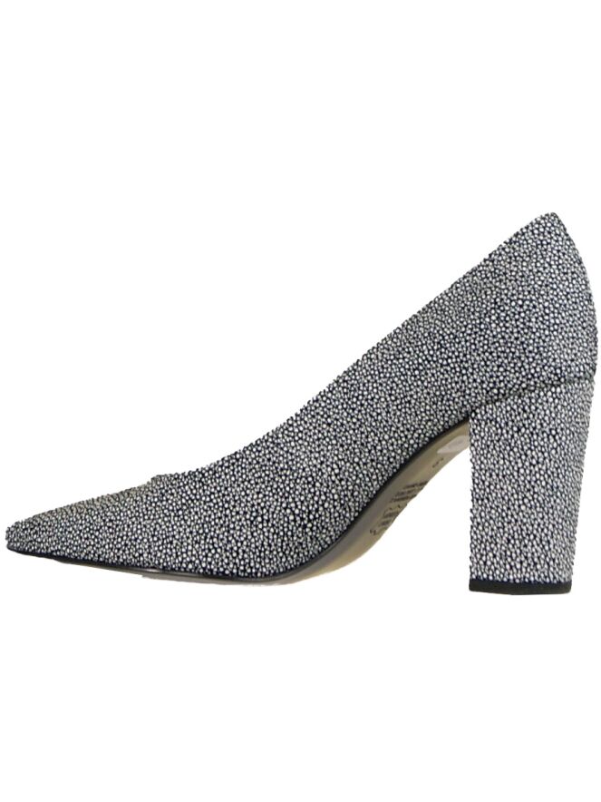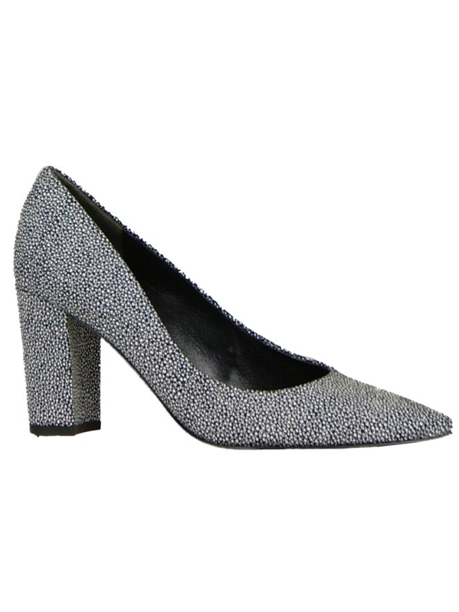 A pump of the brand K & S in a ridged relief print with the colors black and white. The toe is tapered and the pump has a block heel which is covered in the same material as the pump itself
