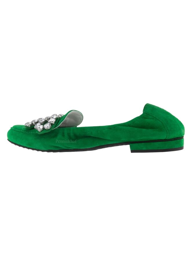 A ballerina from Kennel & Schmenger in the color green. Over the front foot is a decorative bow with imitation diamonds.