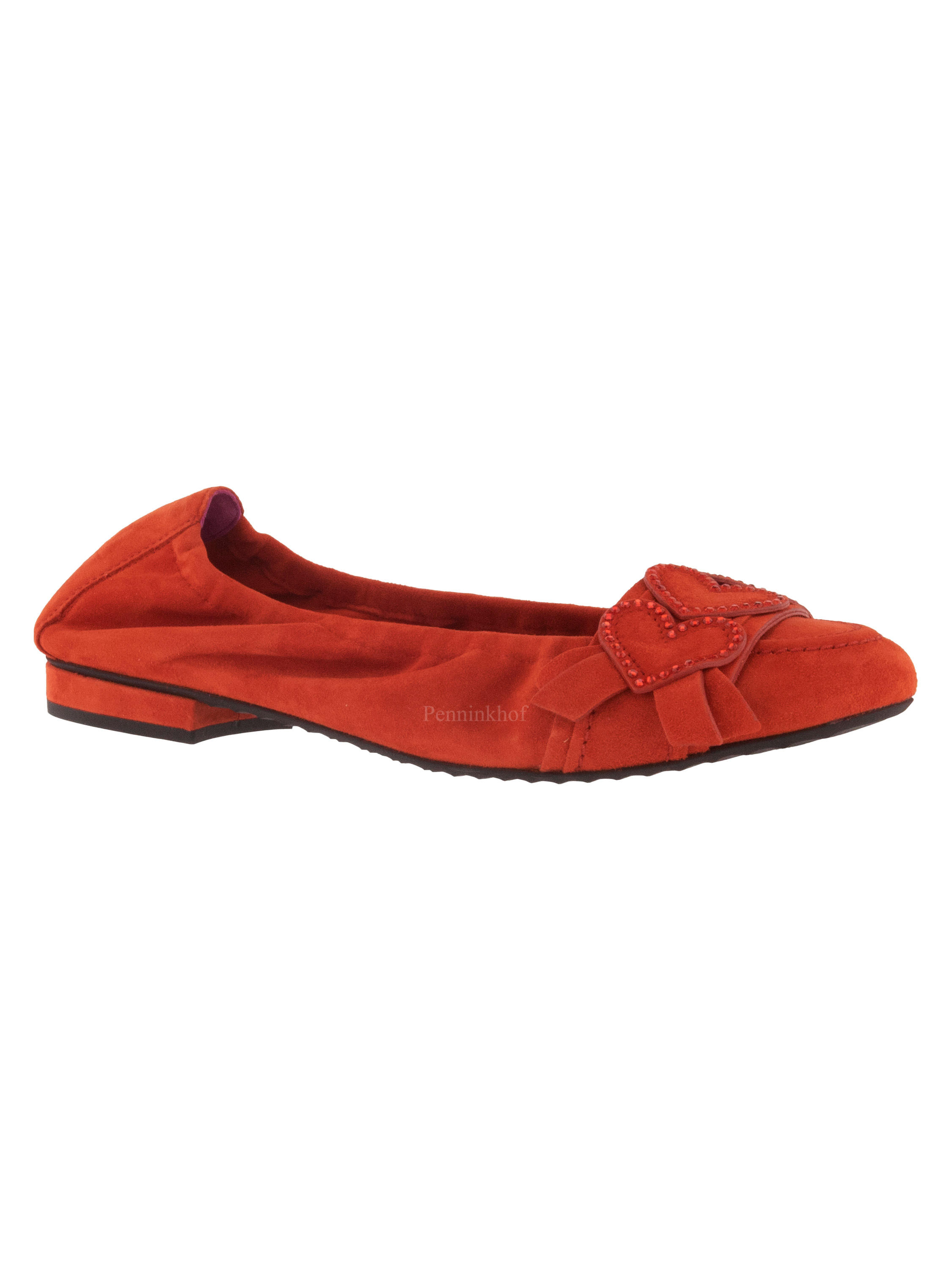 A ballerina from Kennel & Schmenger in the color bright red. Over the front foot is a band with some decorative hearts that have black-colored rhinestones along the edges.