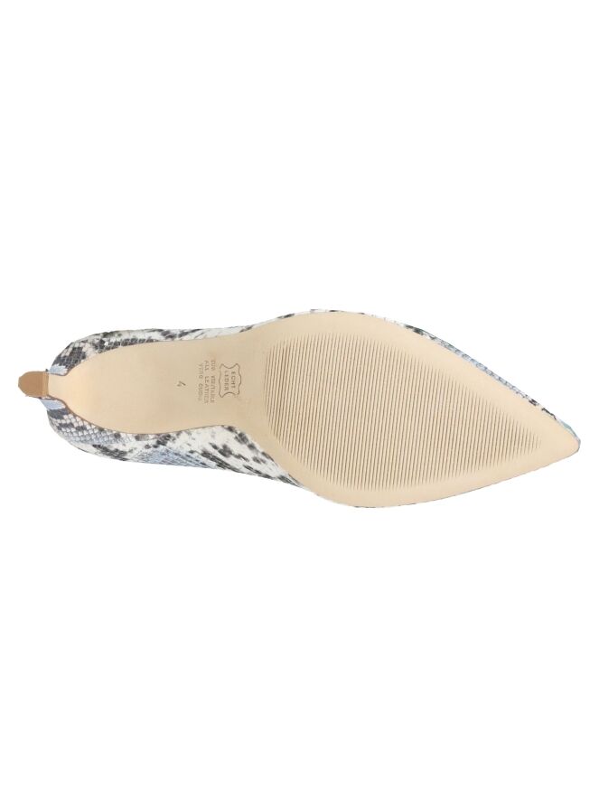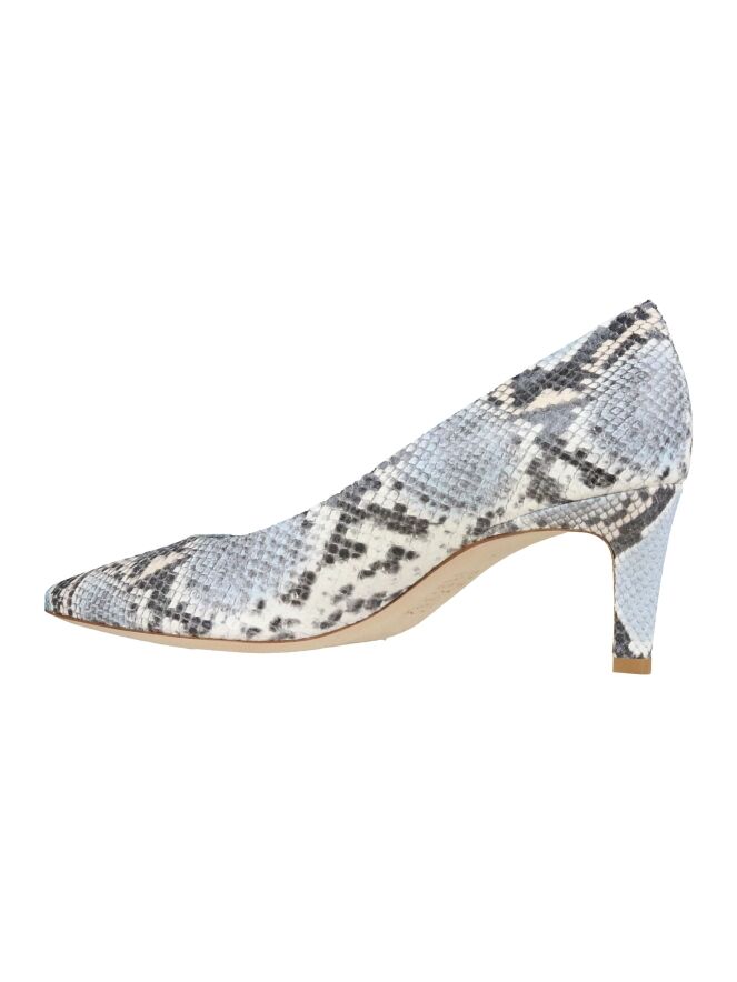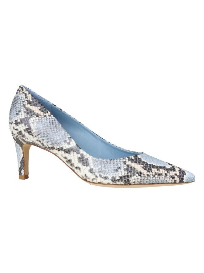 A pump from Kennel und Schmenger in a python print in several shades of blue, creamy white and gray. The pump has a pointed nose. The heel is in the same material as the pump. The inside is lined with leather.