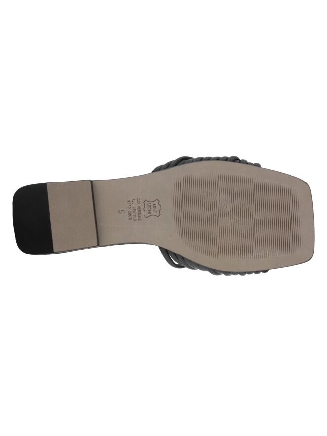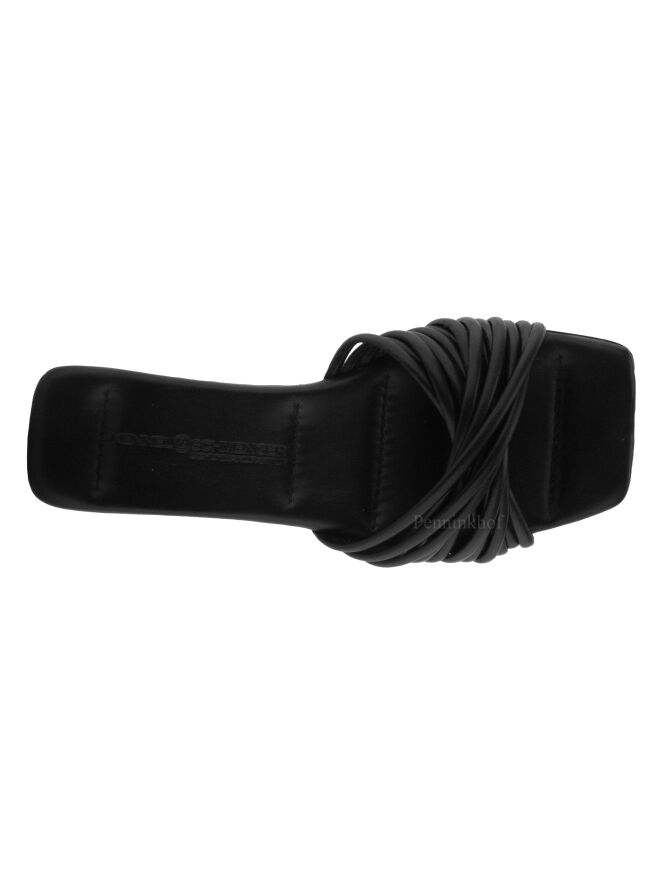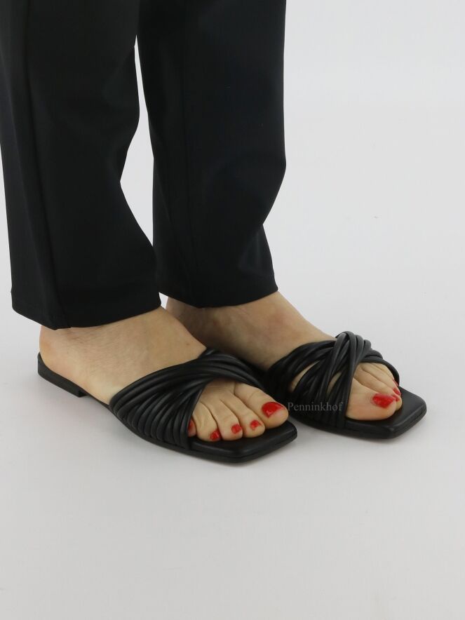 A slipper from Kennel and Schmenger in the color black. At the level of the forefoot, several leather cords are stretched crosswise like a fan.