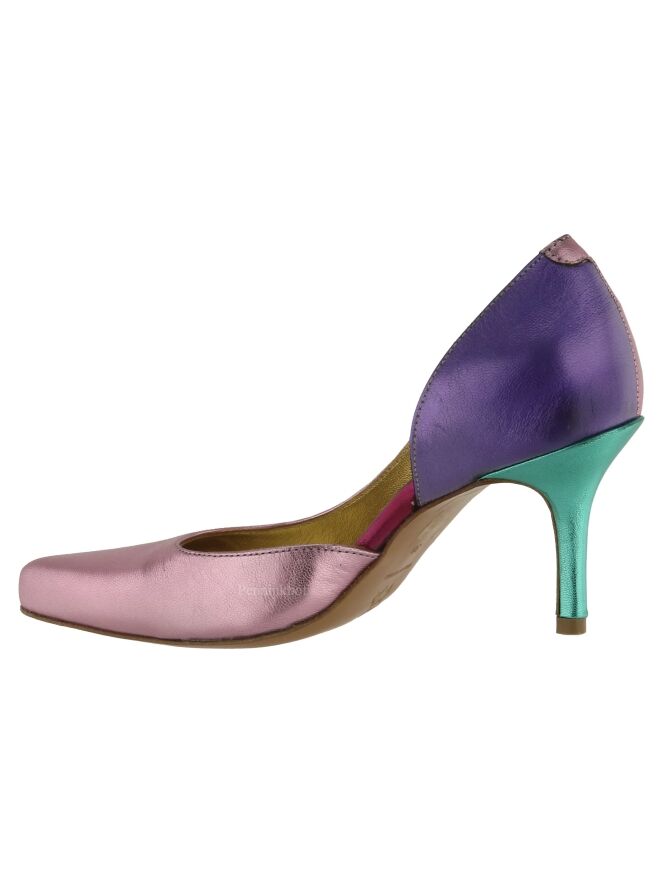 A pump from the brand Madore with the colors pink, purple and a turquoise heel. The inside of the pump is open in the middle. The pump has a pointy nose and is lined on the inside.