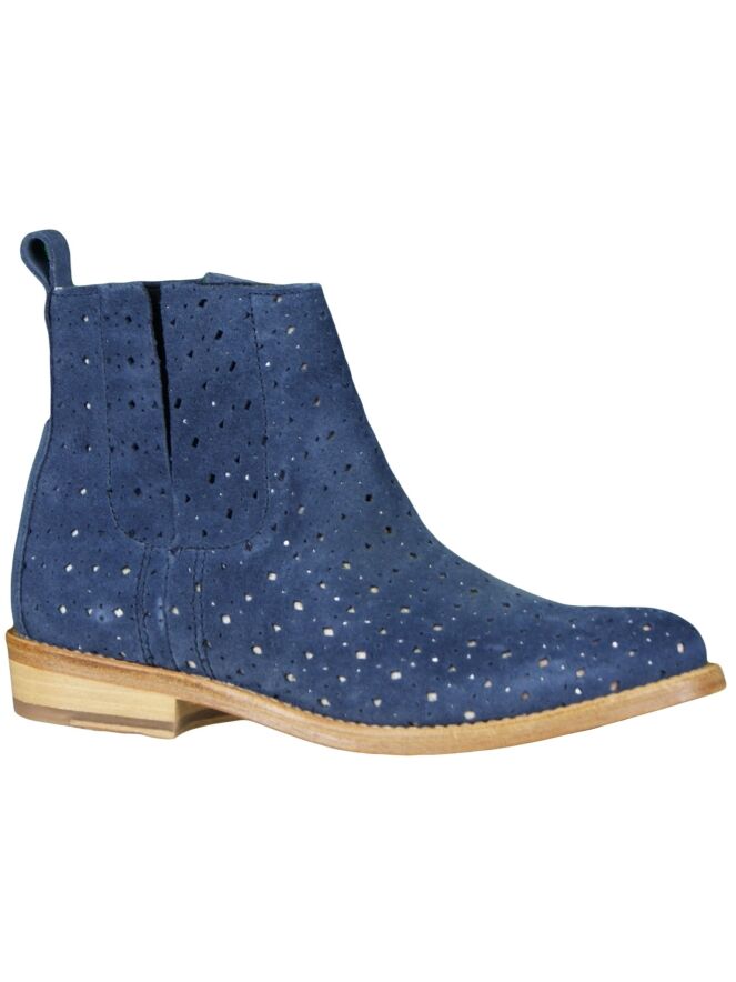A sporty ankle boot of the brand \"Kop en Staart\" in a beige color. The Suede is perforated and in the middle of the shaft is the suede cut with and elastic strap behind the suede processed. The boot has a light brown sole.