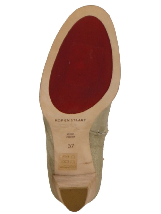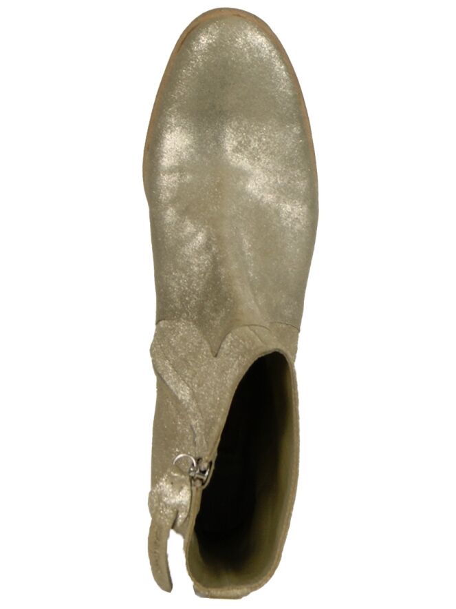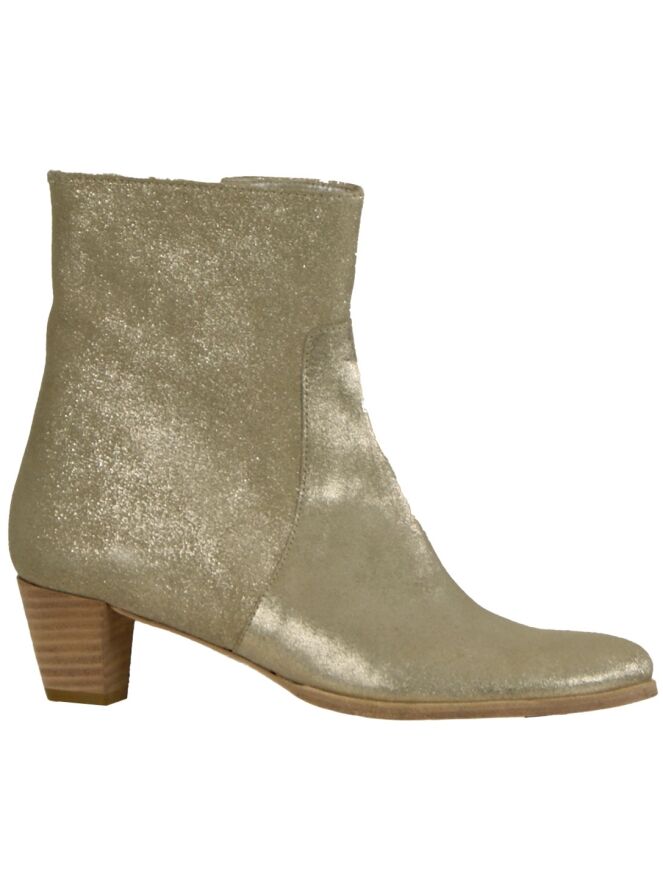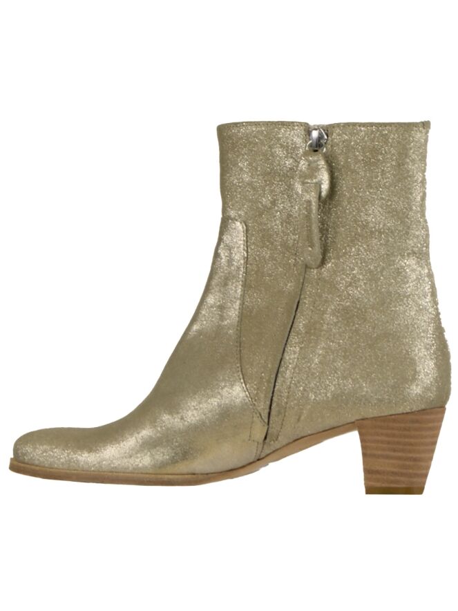 A short boot of the Dutch brand \"Kop en Staart\". The heel of the boot is in a neutral wood colour. The gold color has a look on the boot if it is powdered which gives a softer visual effect. The inner lining is leather.