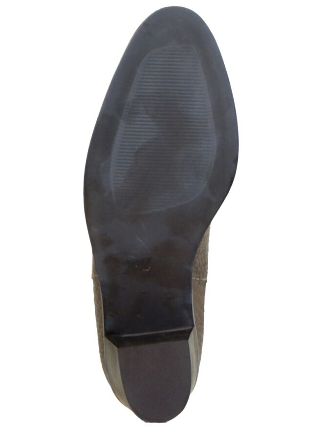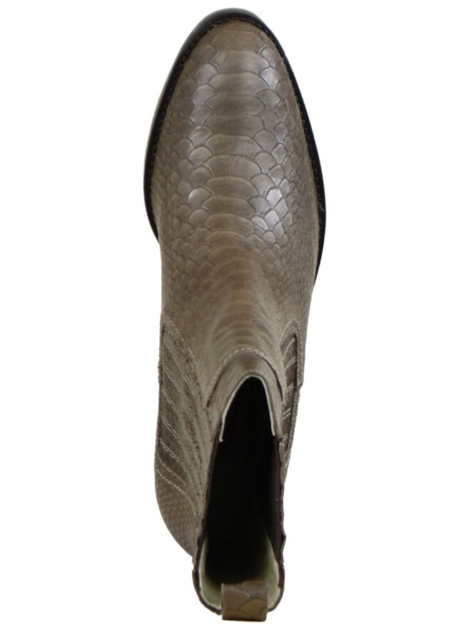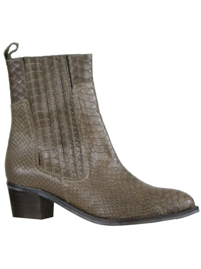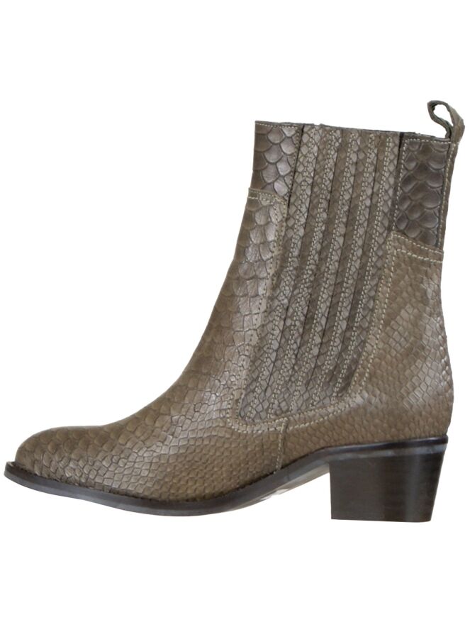 A short boot of the brand \"Kop en Staart\" in a reptile print in the color brown. The sides of the shaft is with strips of leather with elastic band out there behind a processed. The boot has a leather inner lining.