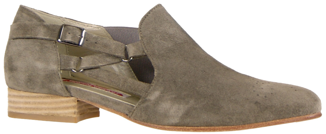 A loafer of the brand "Kop en Staart" in the color taupe. The loafer has a round toe and on the inside of the shoe is an elastic piece deployed. On the outside is a cross buckle processed. these loafer is not lined on the inside.