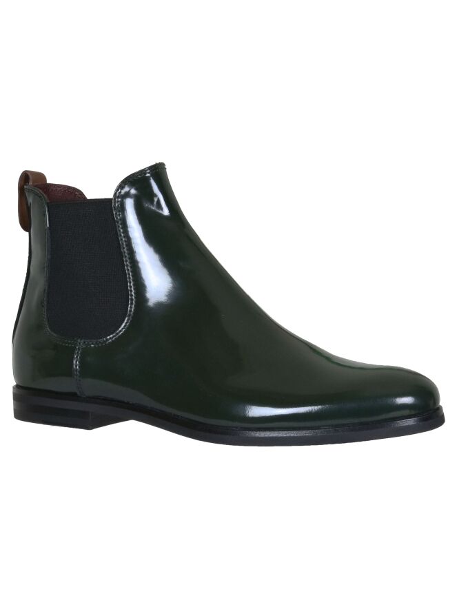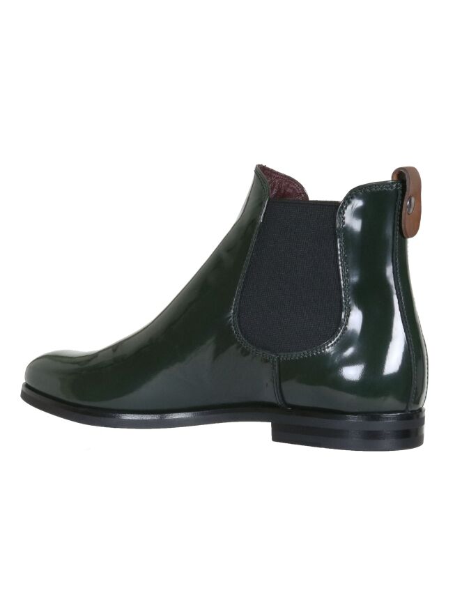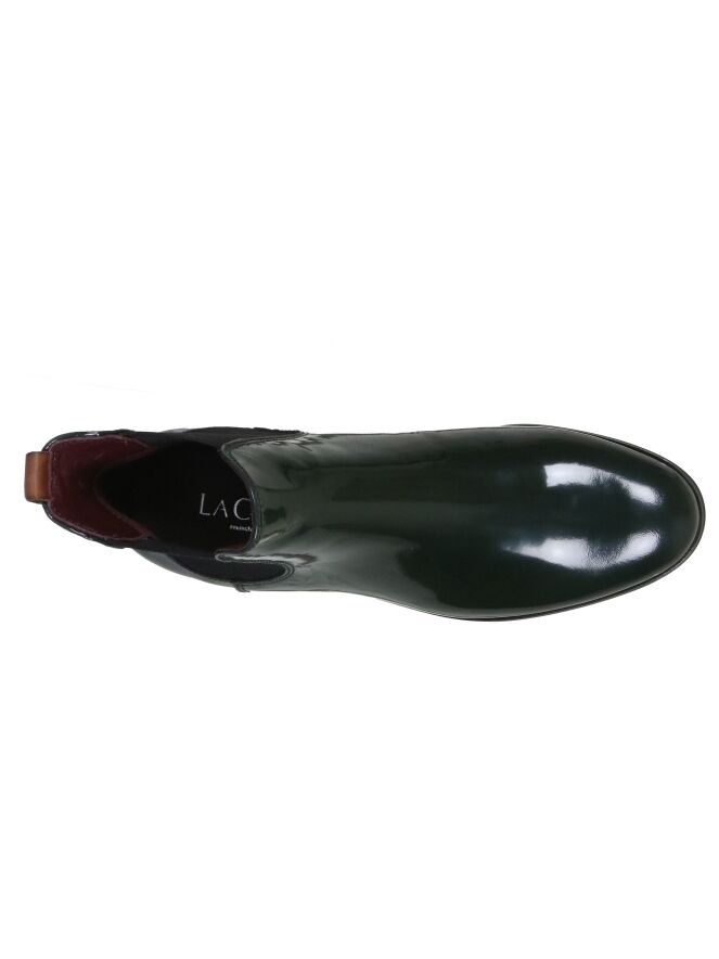 A short boot from La Cabala in the color dark green. At the top of the shaft is a brown tab at the back. There is an elastic piece of fabric on both sides of the shaft. The boot has a round nose and the inside is lined with leather.