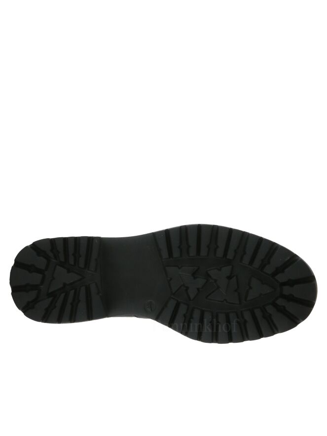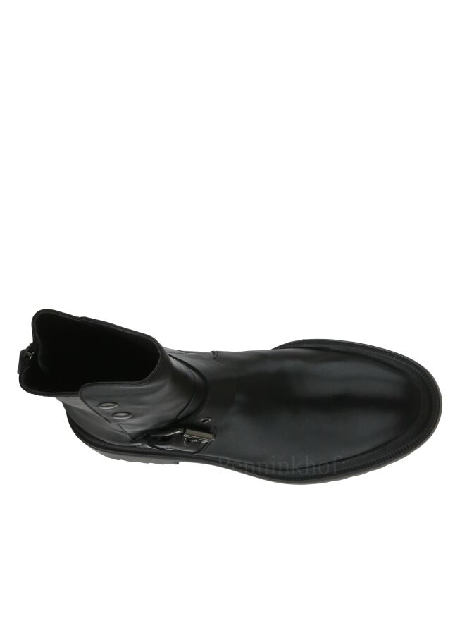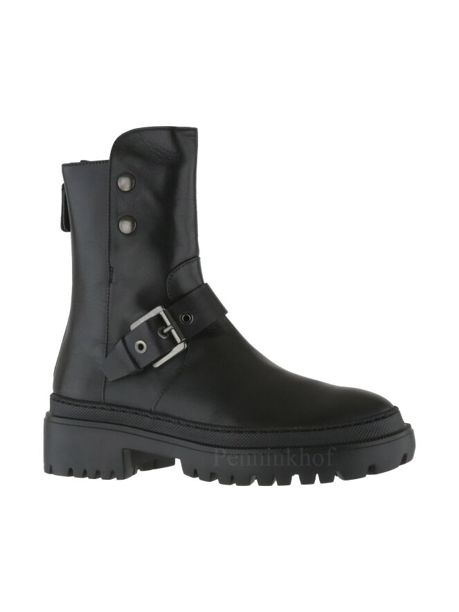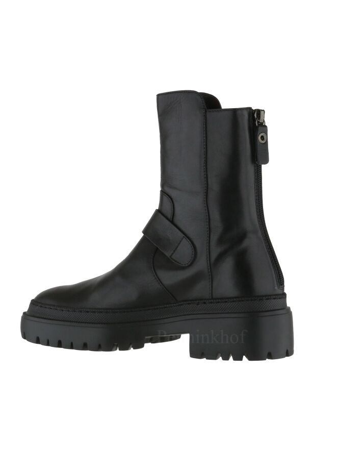 A short boot from La Cabala in the color black. Across the instep is a decorative buckle. On the outside of the shaft are 2 press studs. from the top of the shaft to the back of the heel is a zipper. The inside of the shaft is lined with leather.