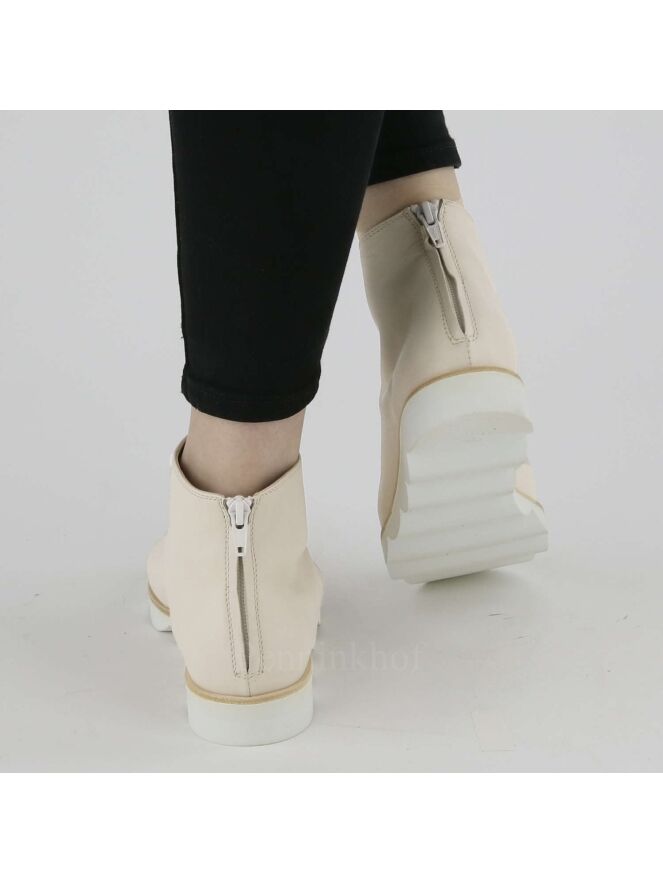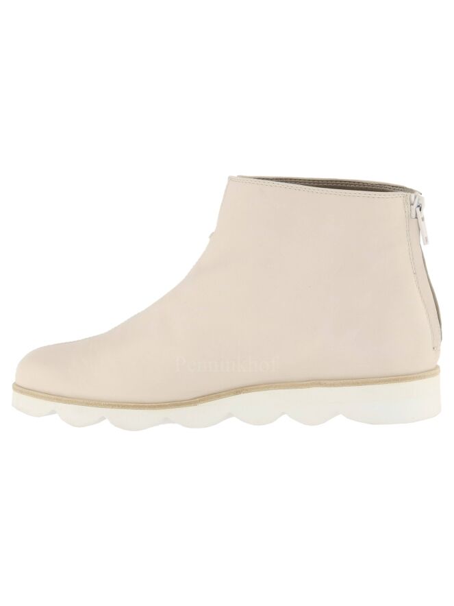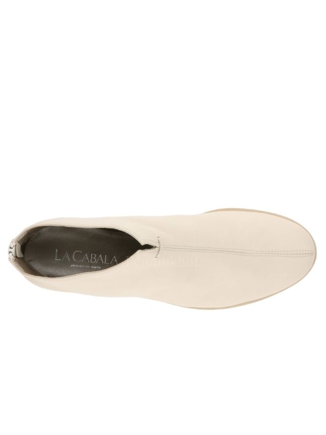 A short boot from La Cabala in a nude color. The boot has a jagged white sole. There is a zipper on the heel. The inside is lined with leather.