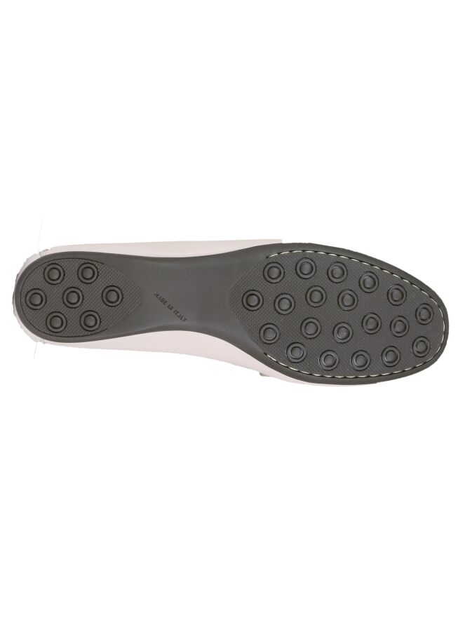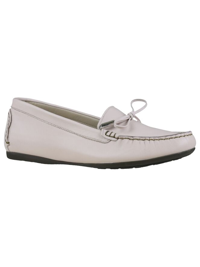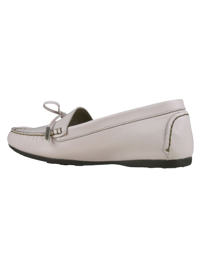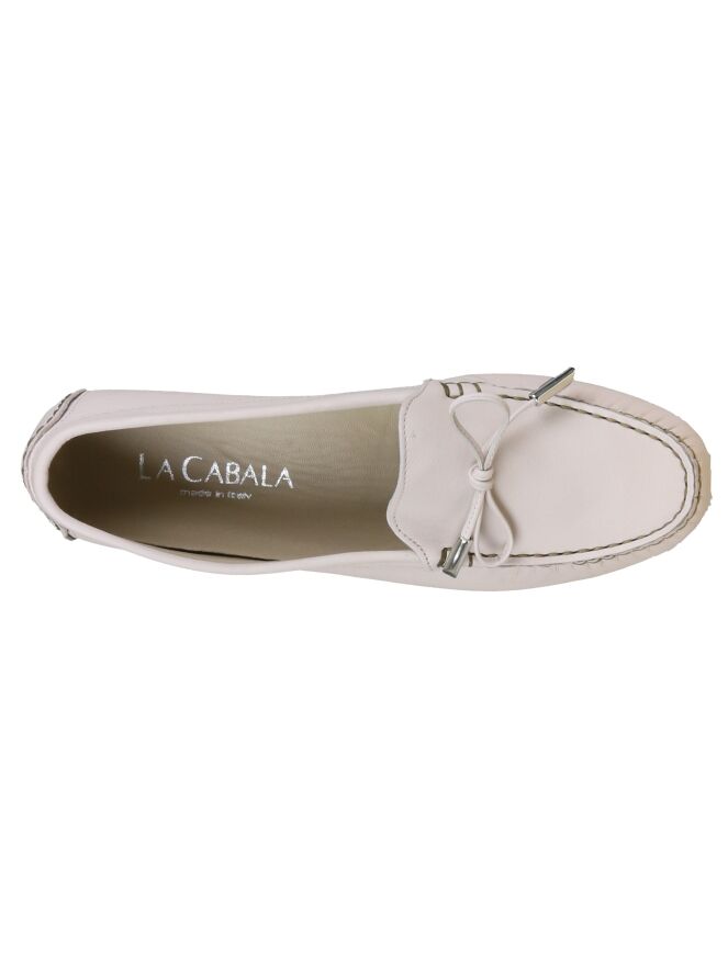 A loafer from La Cabala in the color nude. The edge of the forefoot is stitched through. On the forefoot is a fine bow of leather with silver colored metal end. The insole is removable and the inside is lined with leather.