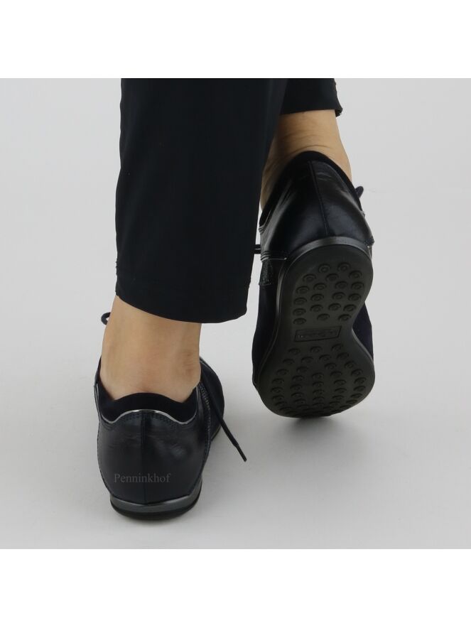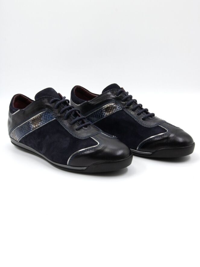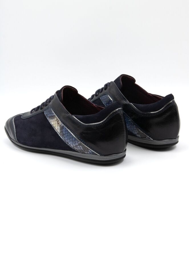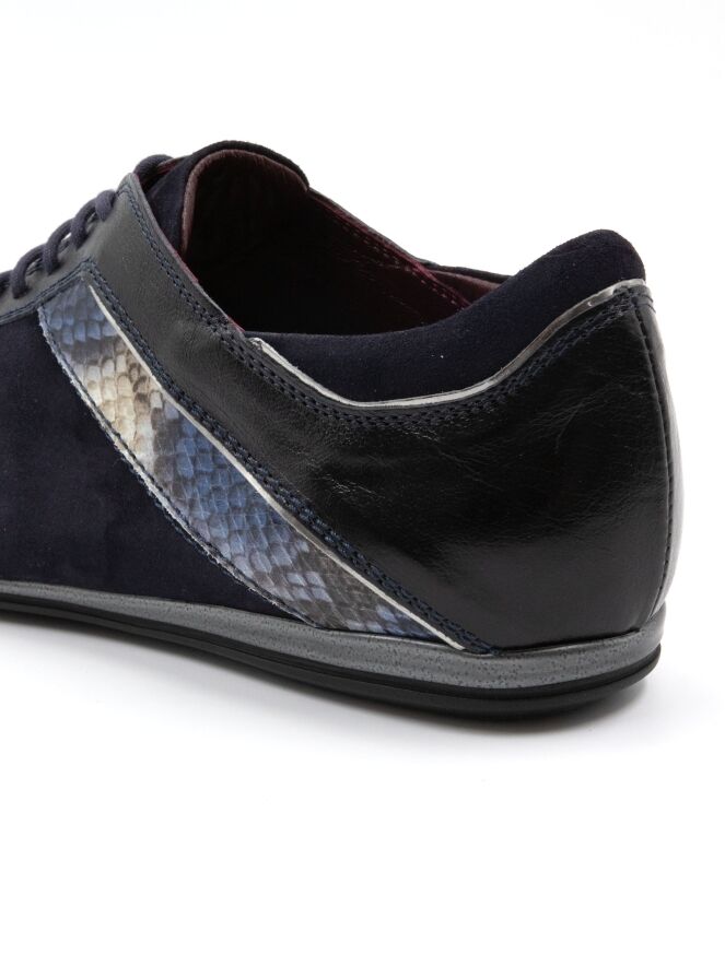 A sneaker from La Cabala in the color navy blue. On the sides is a trim in a reptile print. The sides, tongue and heel are in camoscio suede. The insole is removable. The inside is lined with leather.