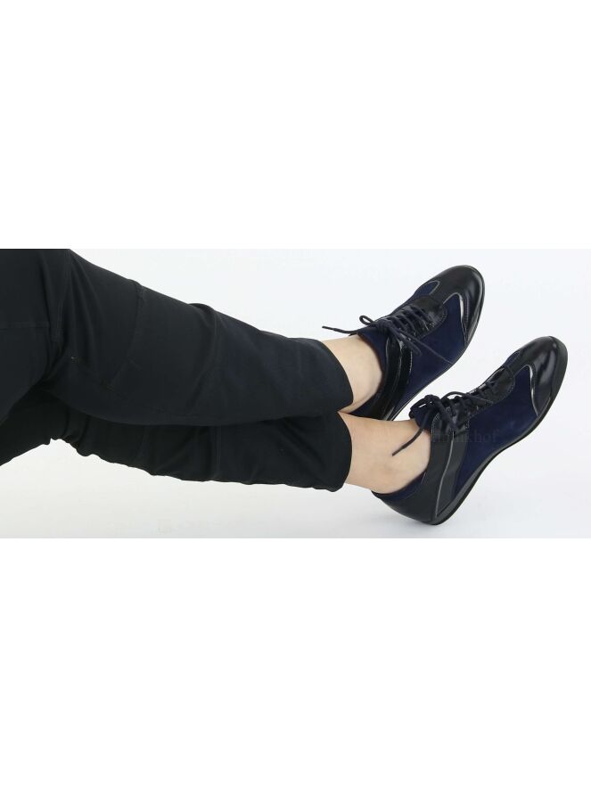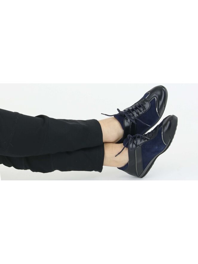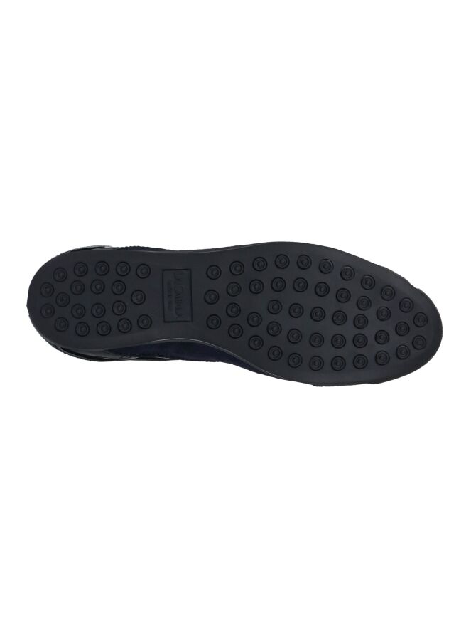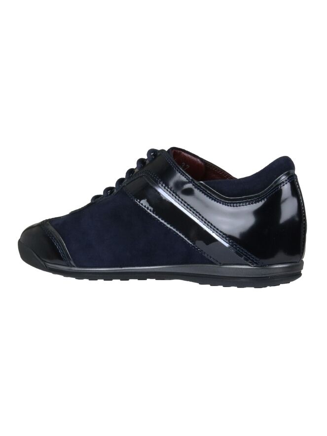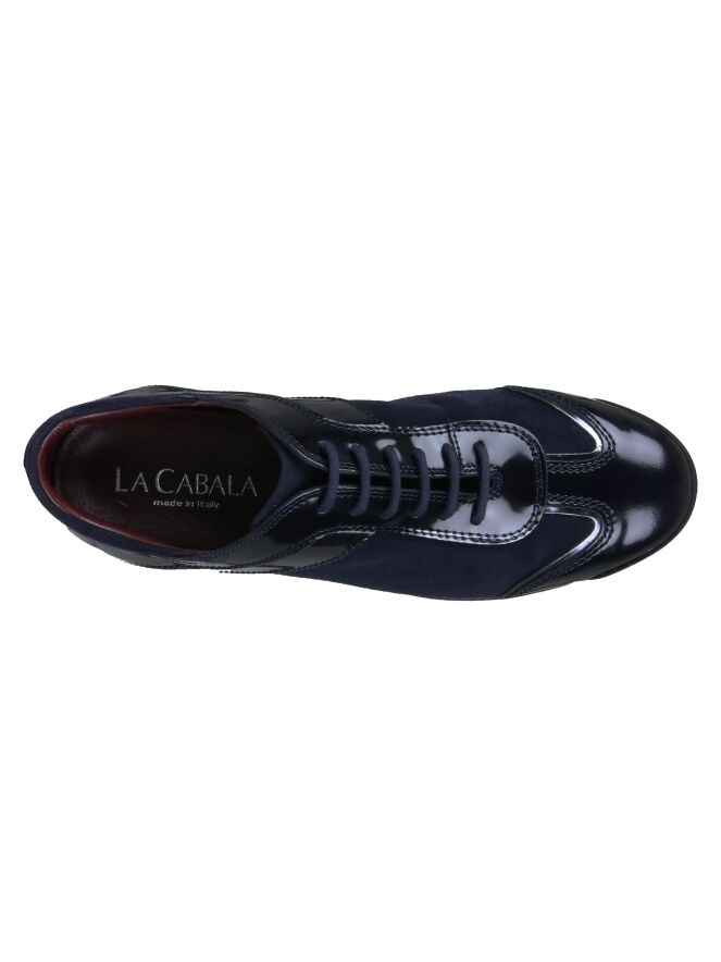 A sneaker from La Cabala in the color navy blue. On the sides is a piping in navy blue patent leather. The sides, tongue and heel are in a camoscio suede. The insole is removable. The inside is lined with leather.