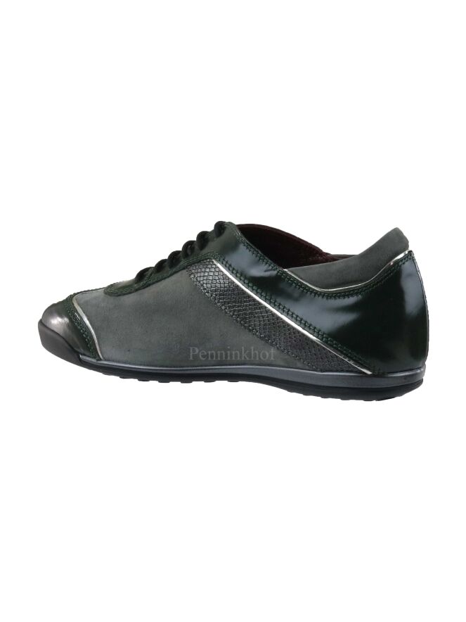 A sneaker from La Cabala in the color dark green. Along the shaft, on the heel and on the nose is patent leather in a dark green color. Along the sides is a piping in a snake print in a bronze color. The sides are gray. The insole is removable. The inside is lined with leather.