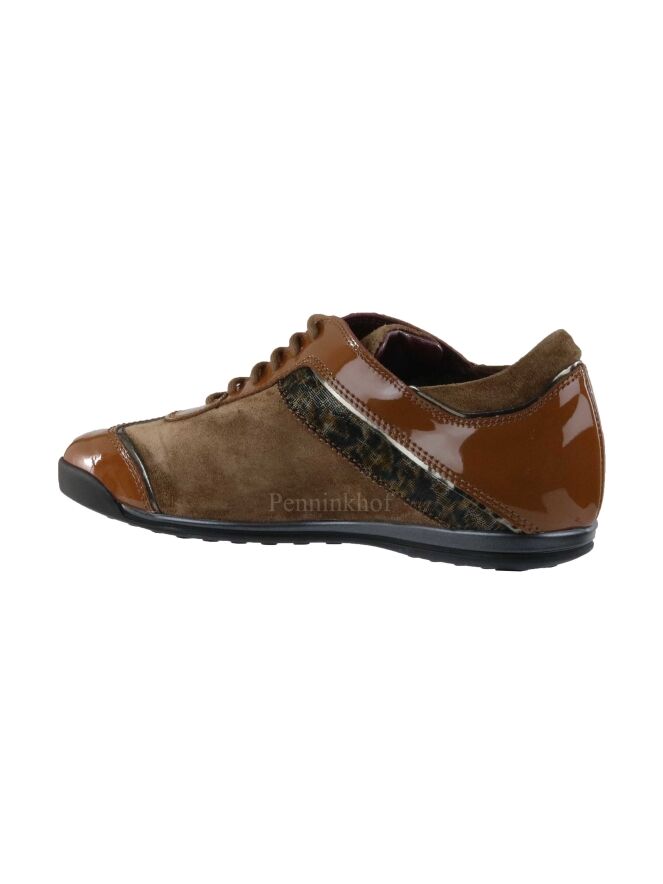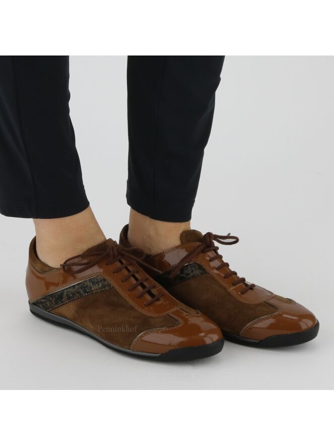 A sneaker from La Cabala in the color cognac. Along the shaft, on the heel and on the nose is patent leather in a cognac color. Along the sides is a stripe in a leopard print with multiple shades of brown and black. The insole is removable. The inside is lined with leather.